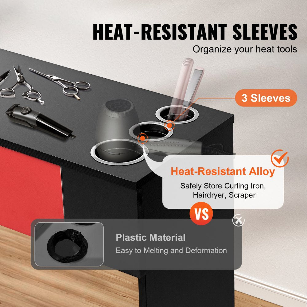Elevate your salon or barbershop with the VEVOR Wall Mount Salon Station, a modern and functional workspace designed for hair stylists and beauty professionals. Featuring a sleek matte black and red finish, this salon station includes one spacious storage cabinet, three open cubbies with a glass door, and two drawers—one of which is lockable for secure storage. With three built-in heat-resistant tool sleeves and a durable MDF construction, this unit combines style, safety, and practicality for everyday salon use.