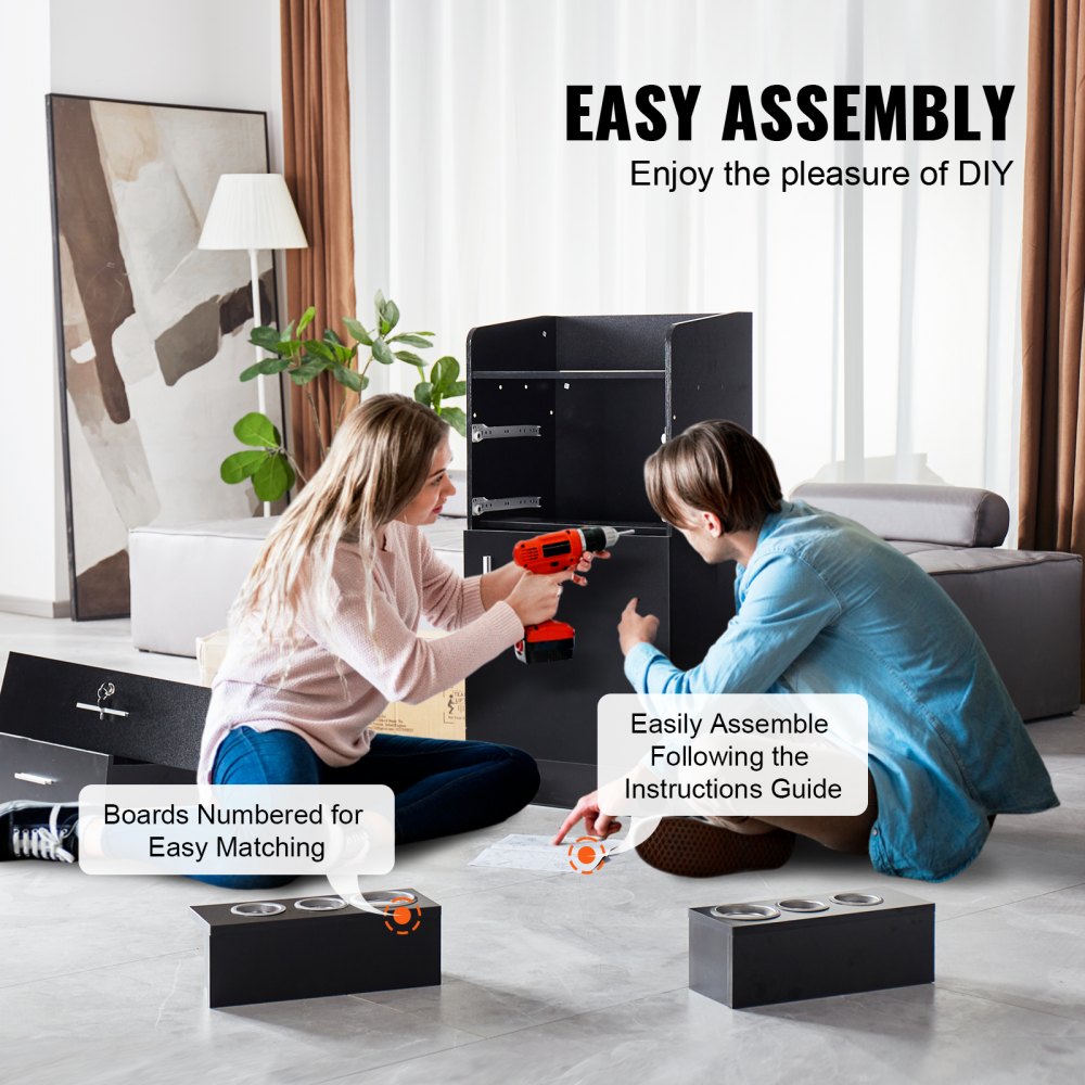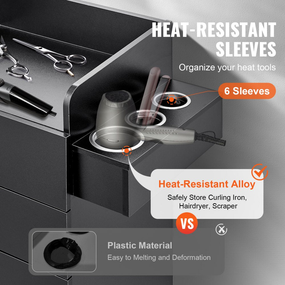Streamline your salon setup with the VEVOR Salon Storage Cabinet—a professional-grade stylist station designed for organization, functionality, and modern appeal. Finished in matte black, this sleek workstation features two drawers (one lockable), six heat-resistant tool sleeves, and a spacious single-door cabinet, offering ample room for tools, supplies, and personal storage. Built from durable MDF and heat-resistant alloy, this station is both practical and stylish, making it ideal for barbers, hairdressers, and beauty professionals.