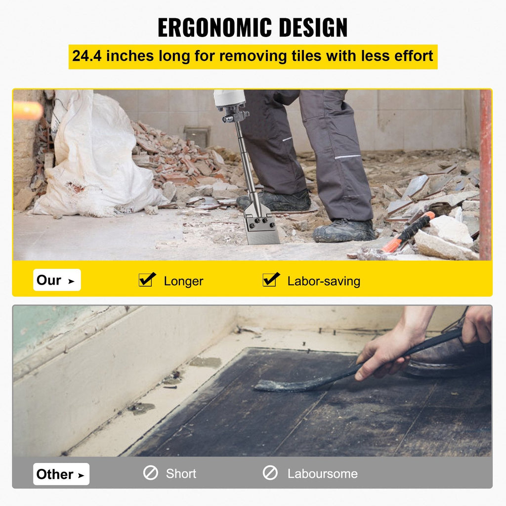 The VEVOR SDS Max Floor Scraper is a rugged, professional-grade tool designed for efficient tile removal and surface prep. Equipped with a 5.9-inch wide blade crafted from high-strength 40Cr steel, it easily handles tough materials like thinset, mortar, and adhesive. The 24.4-inch long handle provides increased leverage and user control, reducing fatigue during extended use. Compatible with SDS-Max rotary and chipping hammers, this scraper also includes a point chisel for targeted removal. Ideal for contractors and DIYers alike, it's a must-have for flooring renovation and demolition tasks.