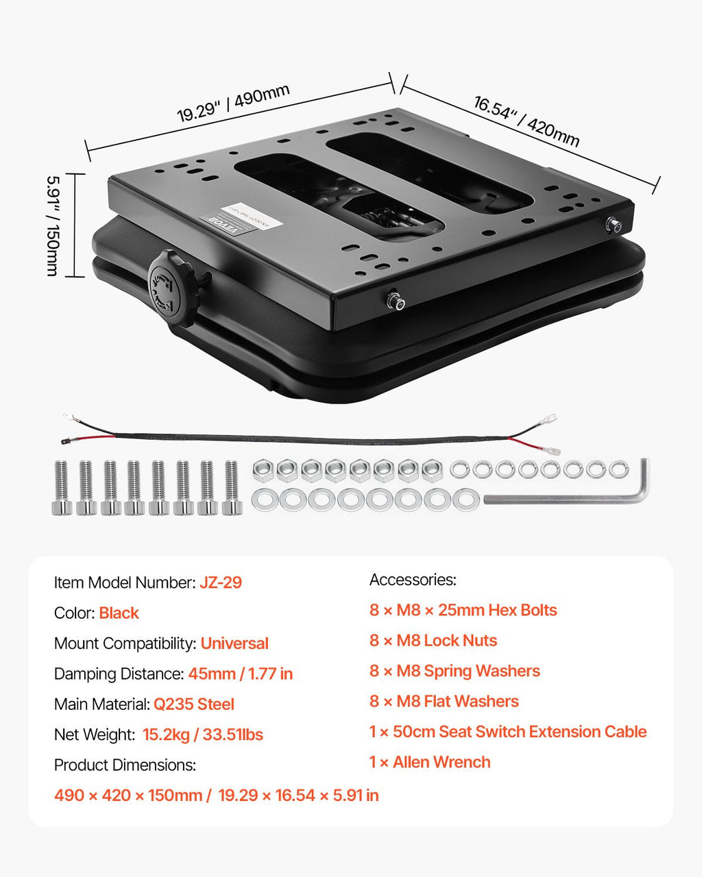 Upgrade your ride comfort with the VEVOR Seat Suspension Kit, designed to reduce shocks and vibrations on lawn mowers, forklifts, and tractors. Built for durability and ease of use, this kit features a universal fit, adjustable damping, and a protective PVC dust cover—delivering performance where it counts.