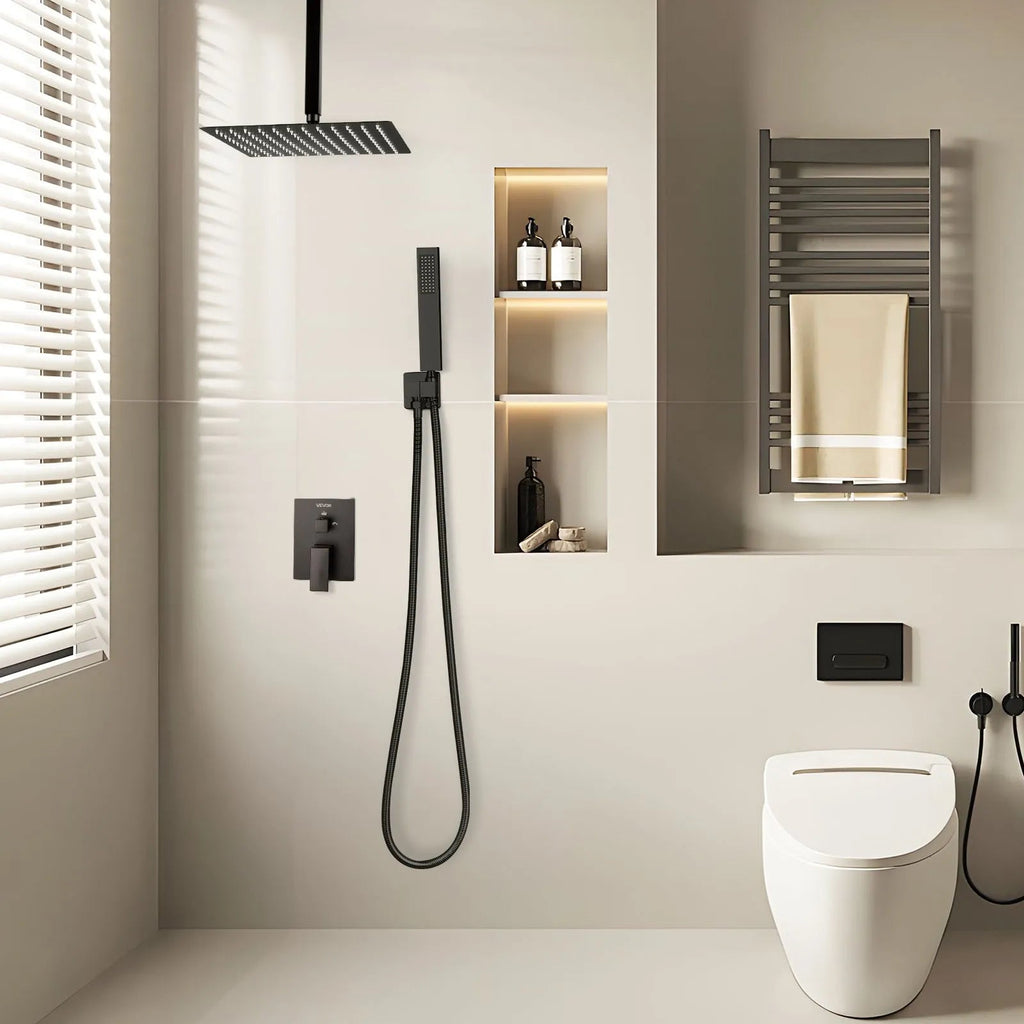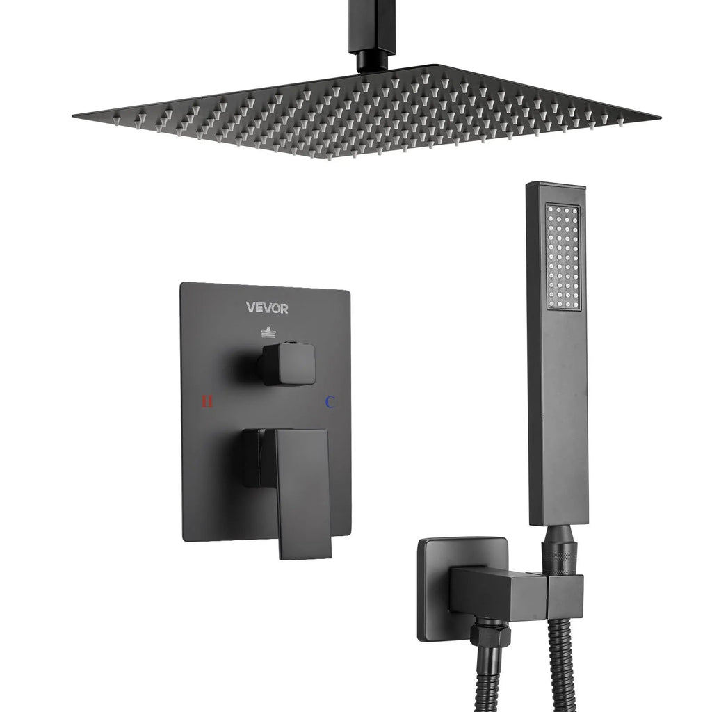 Elevate your bathroom experience with the VEVOR Shower Faucet Set. This rainfall shower system combines a 10-inch square rain shower head with a handheld spray, offering luxurious water coverage and precise temperature control. With durable all-metal construction and modern matte black finish, it’s perfect for residential or commercial bathrooms.