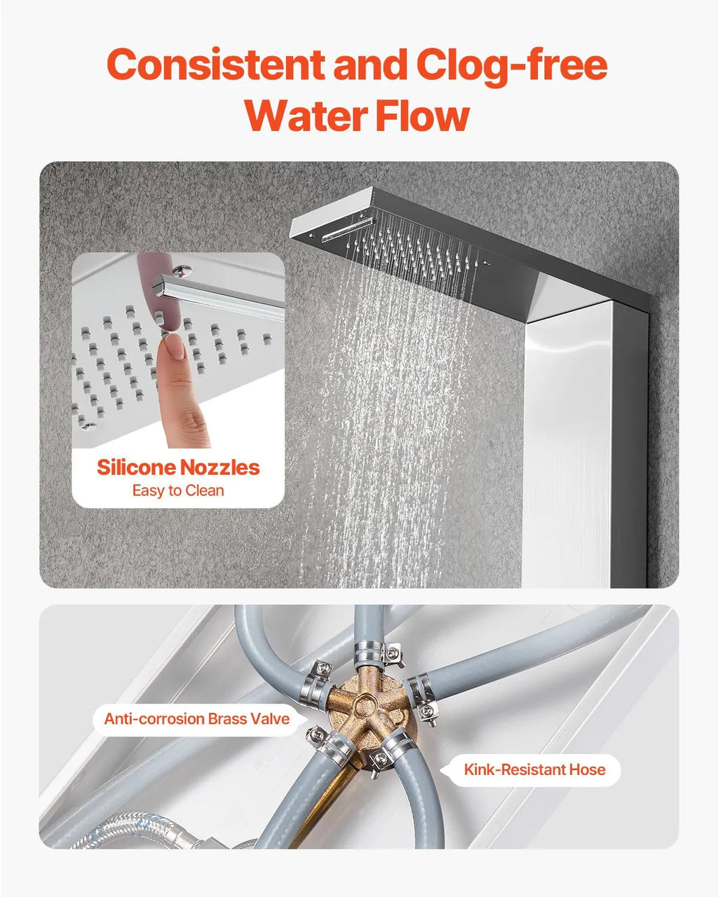Smooth & Stable Water Flow: Brass mixing valve ensures high water pressure resistance and prevents leaks. Silicone nozzles on the stainless steel column are easy to clean.