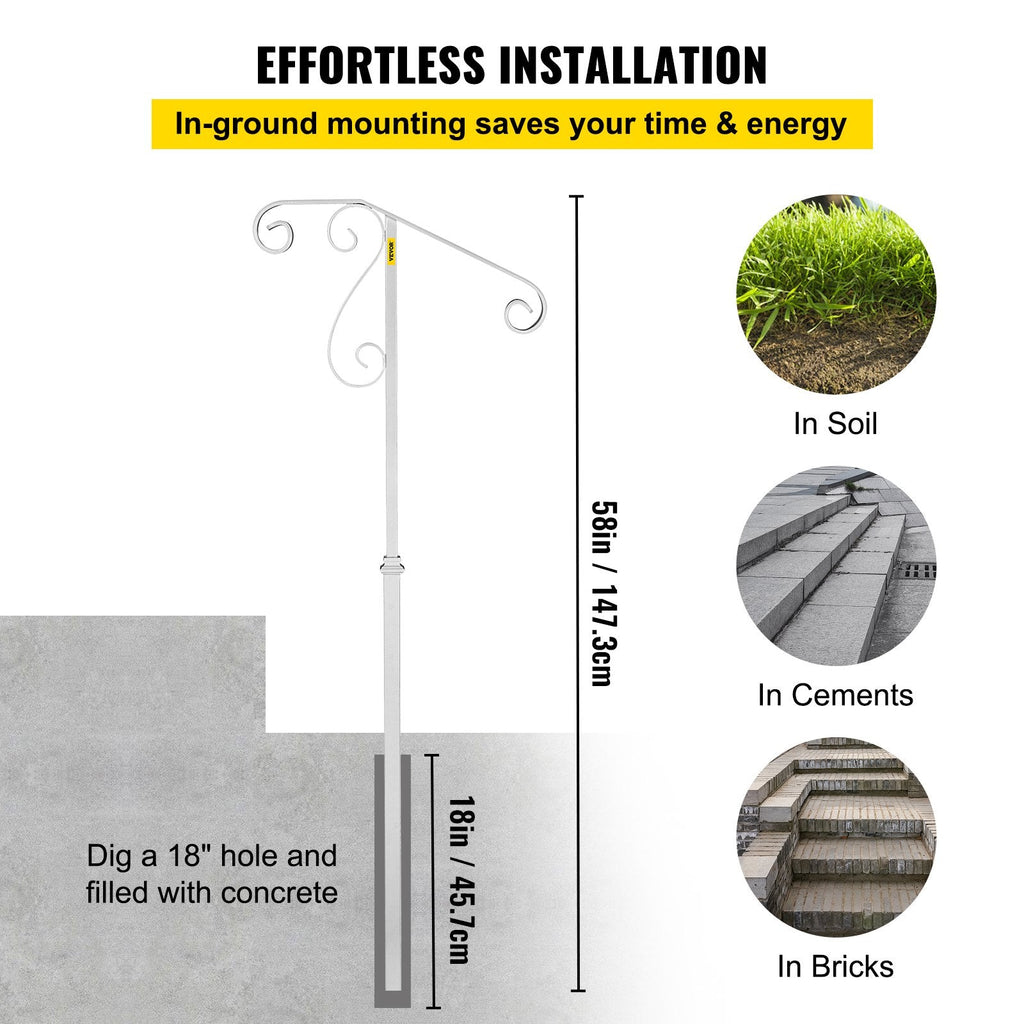The VEVOR Single Post Handrail is a sleek and reliable solution for providing extra support and safety on 1 to 2 step entrances. Crafted from durable wrought iron with a powder-coated white finish, this handrail blends elegant style with long-lasting strength. It’s designed for in-ground mounting, with a tall post that offers firm grip support for various outdoor applications. Whether for garden steps, porch access, or entryways, this grab rail delivers a clean, secure, and stylish finish. Simple to install and built to endure, it's ideal for both residential and light commercial use.