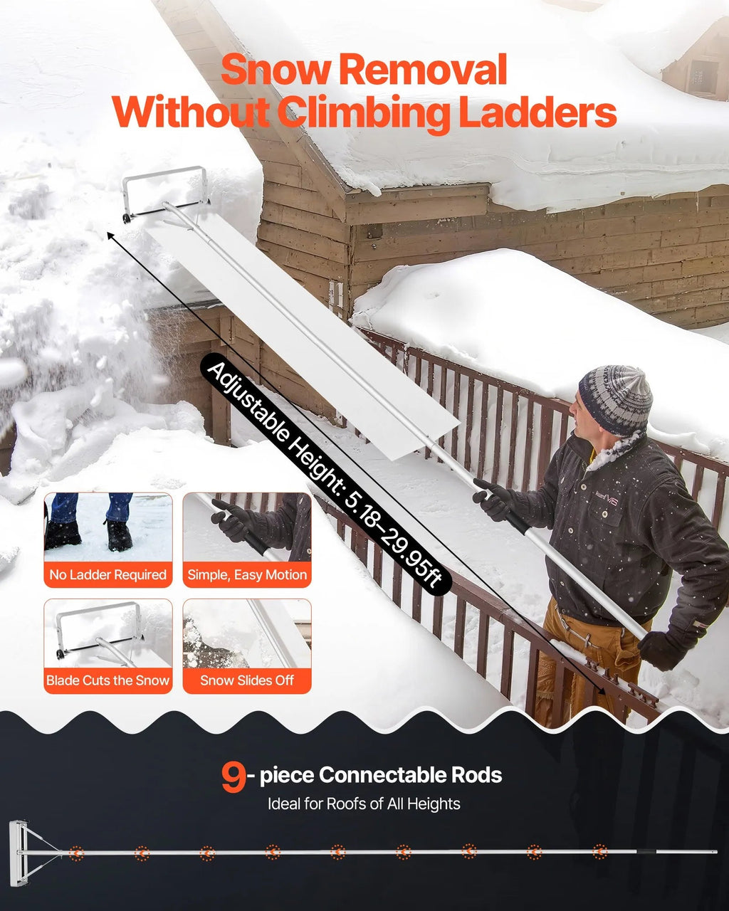 Clear snow from your roof safely and efficiently with the VEVOR Snow Roof Rake. Featuring an 18.5-inch durable aluminum blade and a telescopic handle adjustable from 5.2 to 30 ft, this roof shovel is perfect for house rooftops, garages, cars, and clearing wet leaves. Smooth rolling wheels and an ergonomic handle ensure safe, precise, and effortless snow removal.