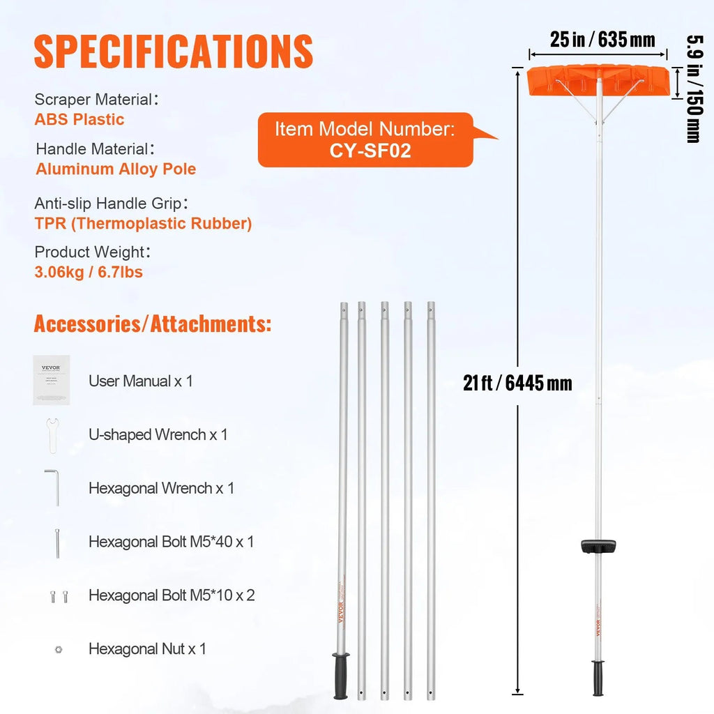 Clear snow from your roof safely and efficiently with the VEVOR Snow Roof Rake. Featuring a 25-inch durable ABS blade and an adjustable aluminum handle reaching up to 21 ft, this roof shovel is perfect for house roofs, cars, and clearing wet leaves. Its stable triangular design and anti-slip handle ensure safe and precise snow removal while reducing strain.