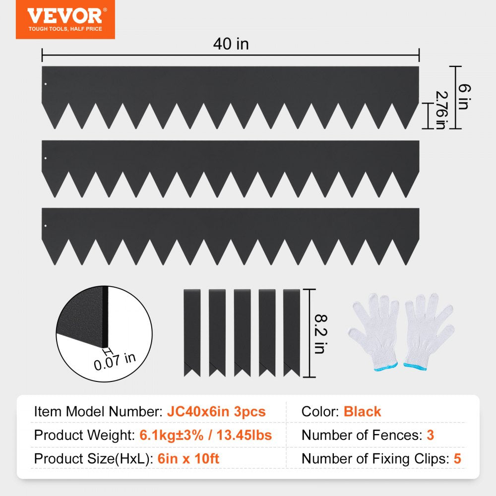 Enhance your garden with the VEVOR Steel Landscape Edging. This set includes 3 durable 40" L x 6" H strips made of high-quality galvanized steel, designed to withstand the test of time. Whether you’re working with soft or hard soil, this versatile, bendable edging border ensures a neat, professional look for your yard or garden. The easy-to-install system includes 5 fixing clips to secure the edging in place, making it perfect for creating clean borders around flower beds, lawns, or walkways. The black finish adds a sleek touch to any outdoor space, while the steel construction offers reliable strength and longevity.