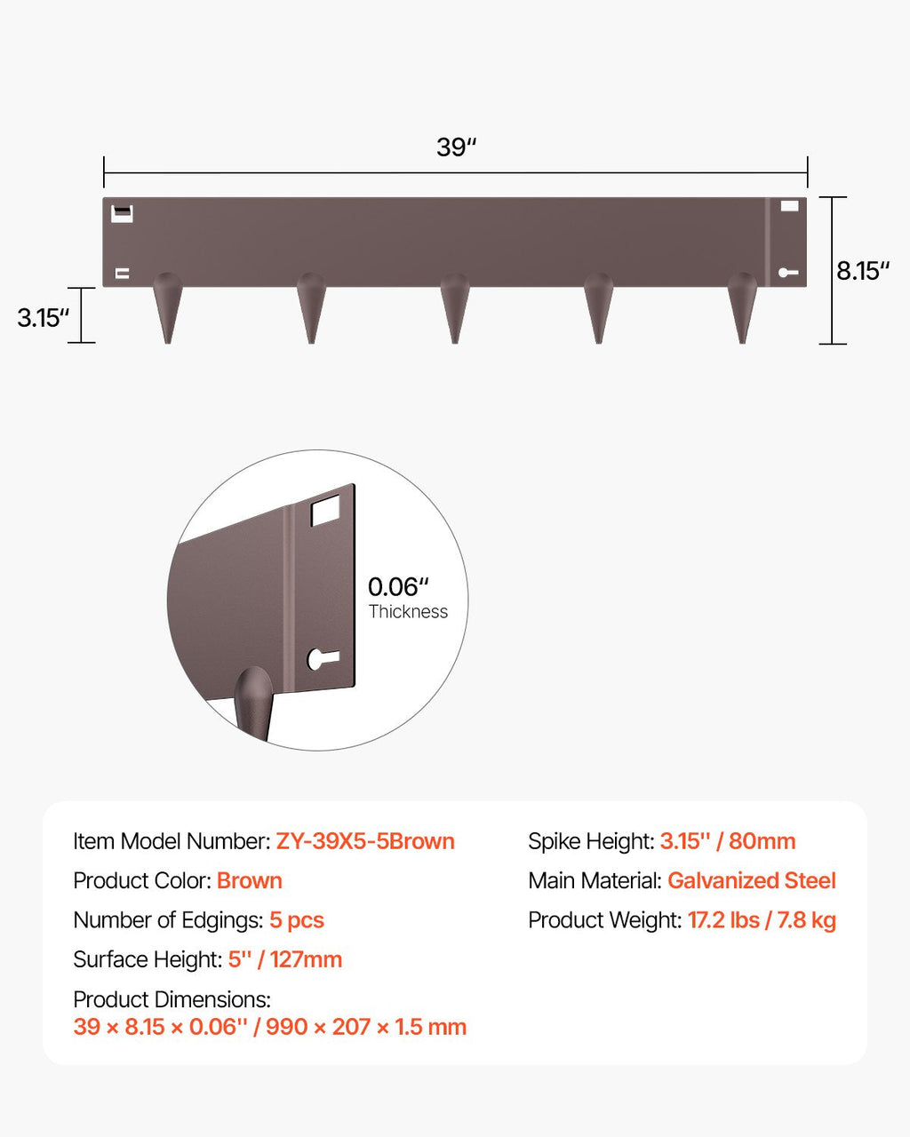 Define clean, durable borders in your garden or yard with the VEVOR Steel Landscape Edging 5-Pack. Crafted from rust-resistant galvanized steel in an attractive brown finish, this set offers a sleek and effective solution for separating lawn, flower beds, walkways, and more. Designed with extra-long spikes and weather-resistant materials for long-lasting performance in any outdoor setting.