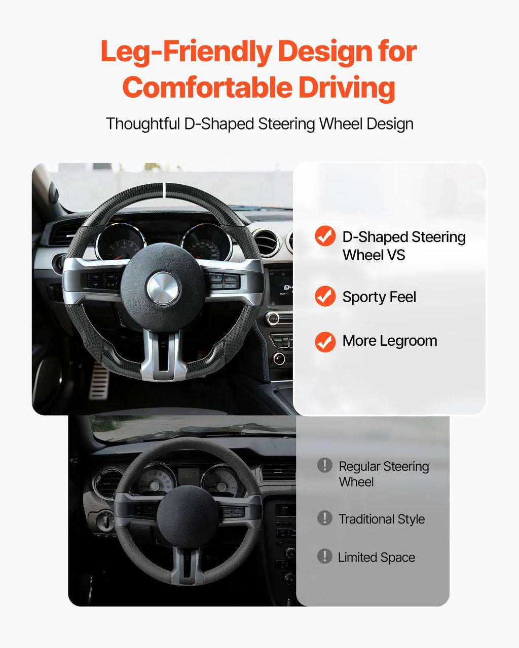 Upgrade your driving experience with the VEVOR Steering Wheel for 2010-2014 Ford Mustang, a D-shaped flat-bottom wheel combining carbon fiber and premium leather for sporty performance, precise handling, and a comfortable grip. Designed for Mustang enthusiasts, this replacement steering wheel enhances control, style, and driving confidence.
