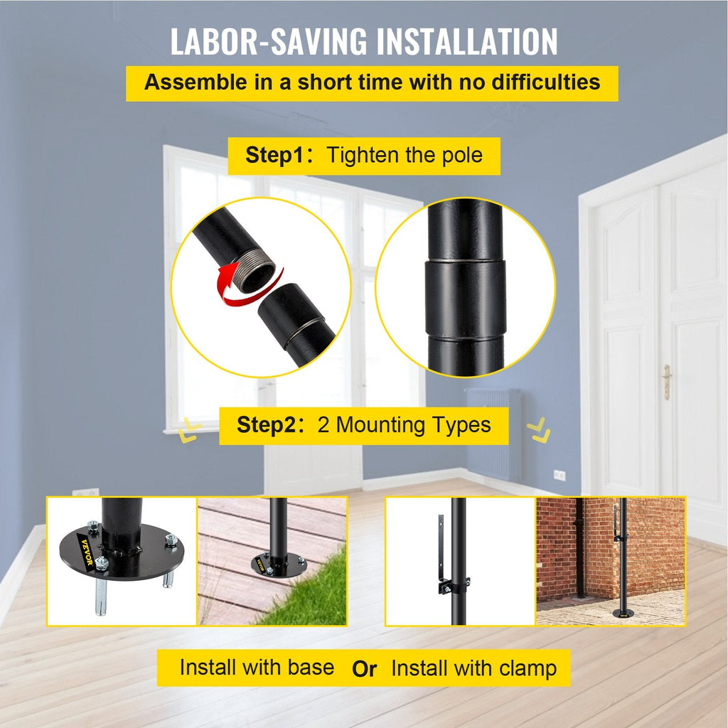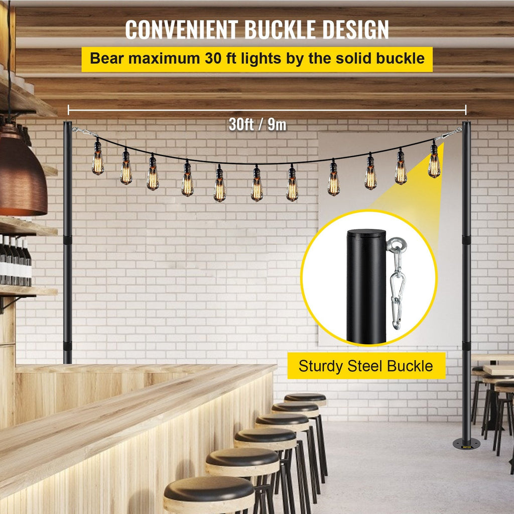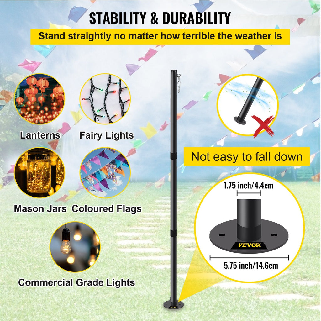 Brighten your outdoor space with the VEVOR String Light Pole, a sturdy 9.6-foot tall stand designed to elevate your string lights effortlessly. Constructed from durable powder-coated steel with a 1.75-inch diameter, this black pole resists rust and weather damage for long-lasting use. It comes with a secure clamp to ensure stable placement, making it ideal for patios, gardens, weddings, parties, and other outdoor events. Easy to set up and highly reliable, this light pole is perfect for creating a cozy, illuminated ambiance wherever you need it.