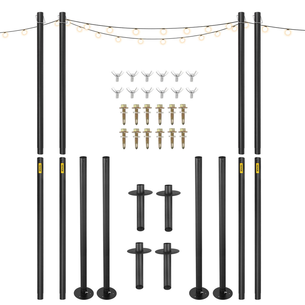 The VEVOR String Light Poles (4 Pack) are the perfect solution for enhancing your outdoor space with decorative lighting. Standing at 10.6 feet tall, these poles are made of durable Q195 steel with a powder-coated finish for superior weather resistance and strength. The poles feature hooks for hanging lanterns, flags, or string lights, making them ideal for decorating gardens, patios, decks, and backyards for parties, weddings, or other outdoor events. With a weight capacity of 44 lbs per pole, these sturdy poles can hold your lighting and decorations with ease. Effortless installation and thoughtful design make them a versatile addition to any outdoor space.