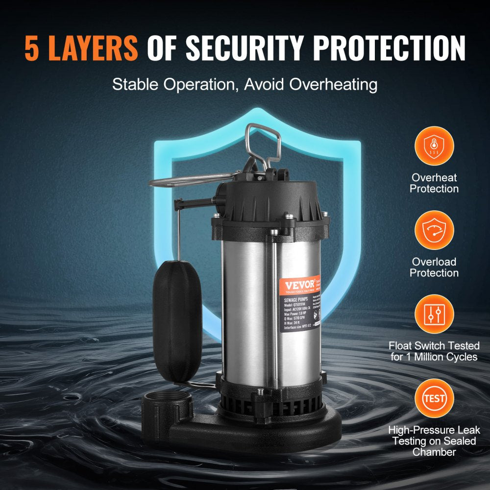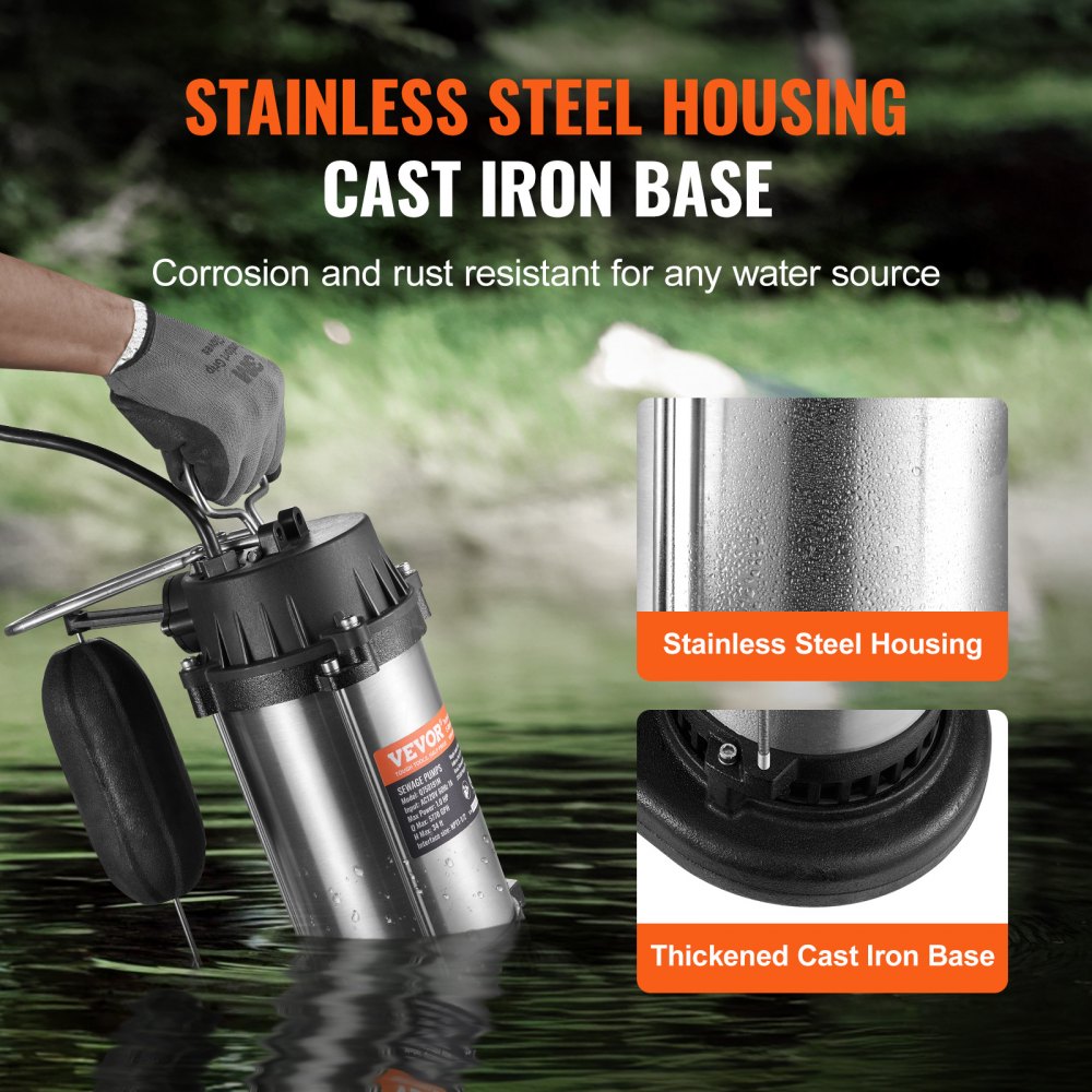 The VEVOR Submersible Sewage Pump is a powerful 1HP water pump engineered for heavy-duty applications like basement drainage, sewage transfer, and flood control. With a high flow rate of 5770 GPH and a max lift of 34 feet, this pump delivers exceptional performance for both residential and industrial needs. Its stainless steel and cast iron construction ensures long-lasting durability, while the IPX8 waterproof rating offers reliable operation under submerged conditions. Designed with anti-clogging technology and a sturdy base, this pump is efficient, easy to operate, and versatile for various water removal tasks.