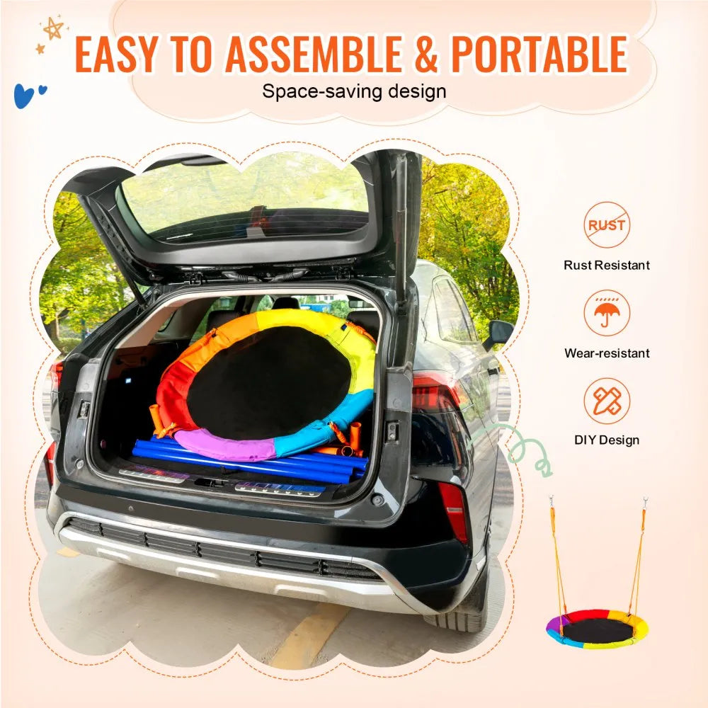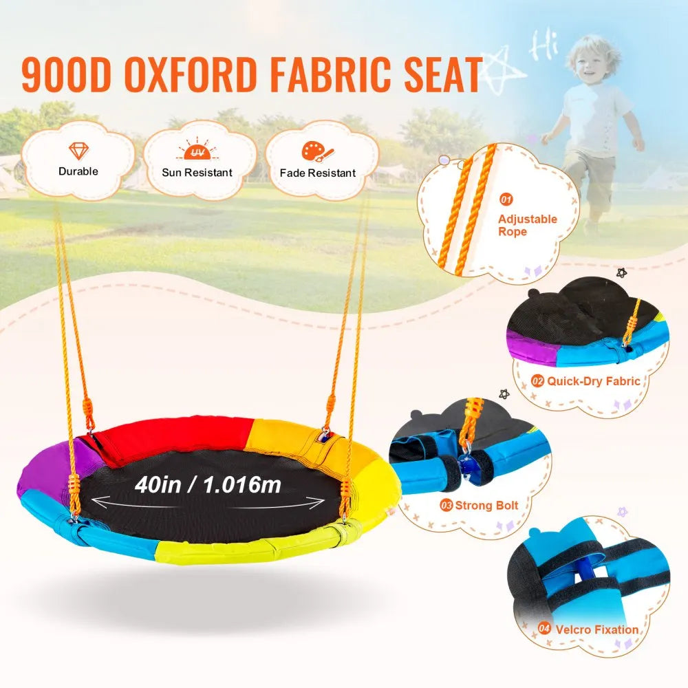 The VEVOR Swing Set features a 40-inch saucer swing seat mounted on a sturdy A-frame metal stand, providing safe and fun backyard entertainment for kids and adults. Built with durable steel pipe construction and a 900D Oxford fabric seat, it supports up to 440 lbs. The swing includes adjustable PE ropes, an interchangeable base for flexible setup, and easy installation, making it perfect for various outdoor activities.