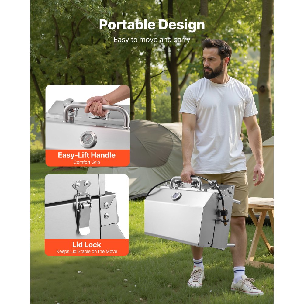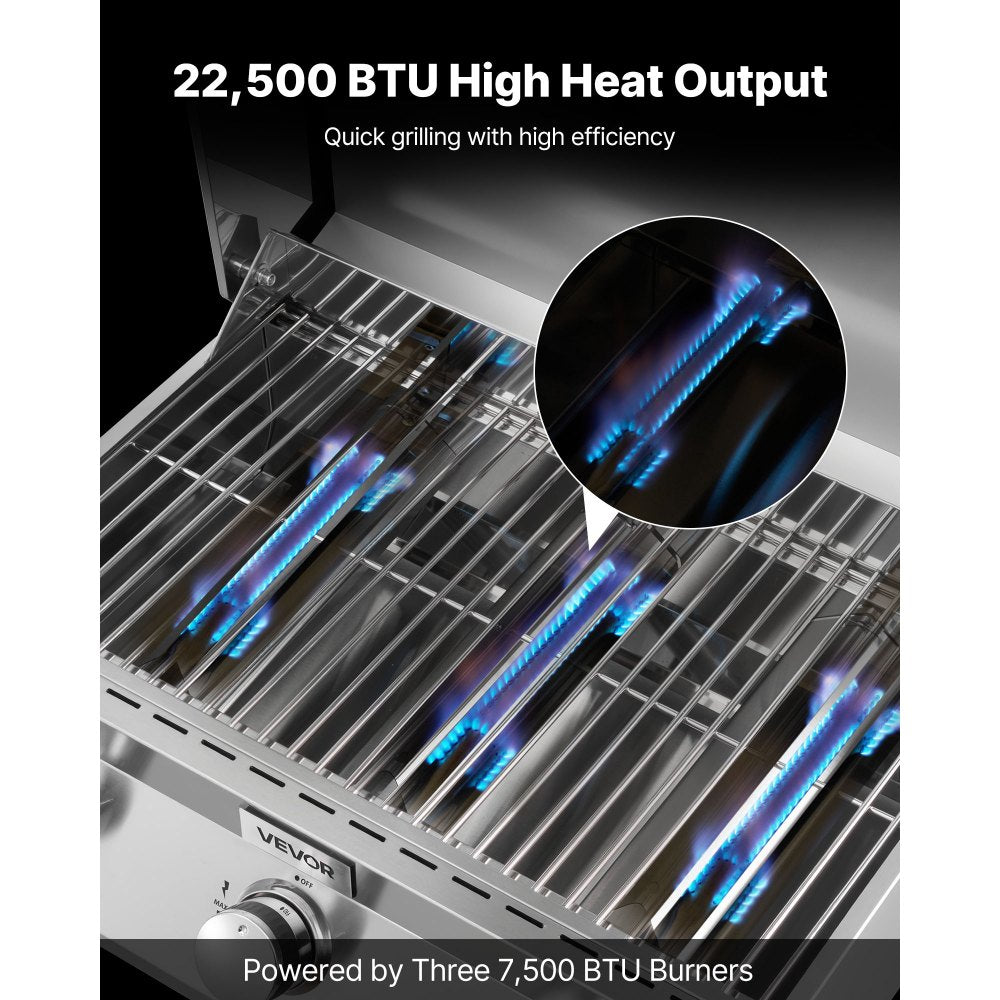 Enjoy powerful and portable grilling with the VEVOR tabletop gas grill, designed to deliver fast, even heat wherever you go. With three stainless steel burners, a spacious cooking surface, and secure travel-friendly construction, this compact grill is perfect for camping, patios, RV trips, tailgating, and outdoor gatherings. Built for performance and convenience, it brings full-size grilling power in a portable design.