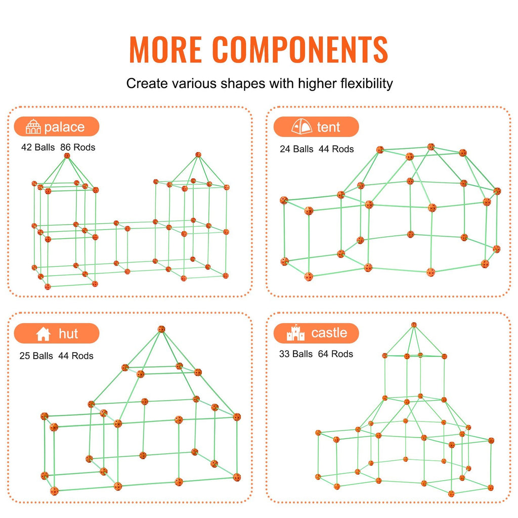 Spark your child’s creativity and problem-solving skills with the VEVOR Tent Fort Building Kit – a 140-piece STEM construction toy designed for hands-on fun and learning. Featuring 96 flexible rods and 44 connecting balls, kids can build anything from tunnels to rocket ships and forts. The rods glow in the dark, adding an exciting element for nighttime adventures. Lightweight and easy to store, this kit encourages collaboration, imaginative thinking, and endless building possibilities—perfect for indoor play or rainy-day activities.