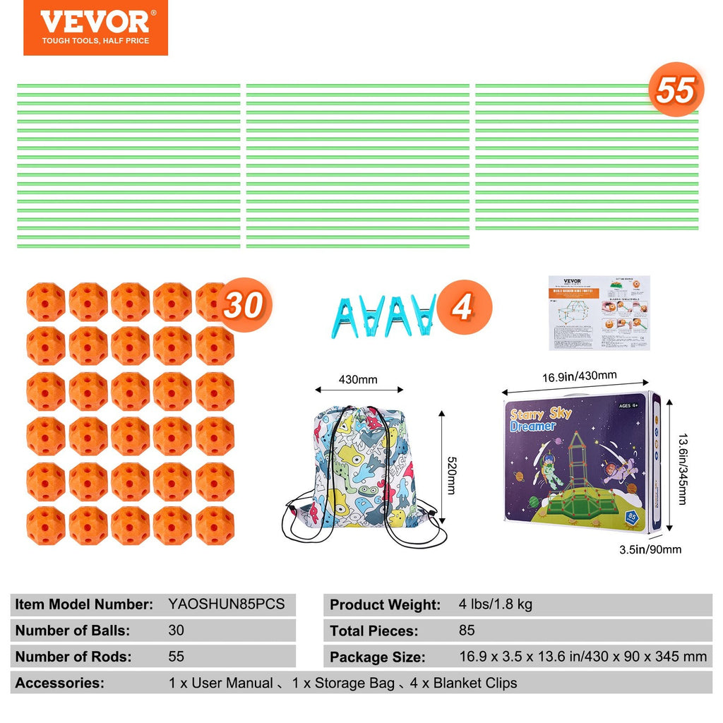 The VEVOR Tent Fort Building Kit for Kids is an exciting educational and creative toy designed to spark your child's imagination. With 85 pieces, including 55 rods and 30 balls, this STEM construction toy encourages innovative thinking and hands-on learning. The cool glow-in-the-dark feature adds an extra fun element for nighttime play. Versatile and portable, it allows your child to build their own forts, tents, or imaginative structures. It’s the perfect gift for young builders, providing endless hours of entertainment and learning.