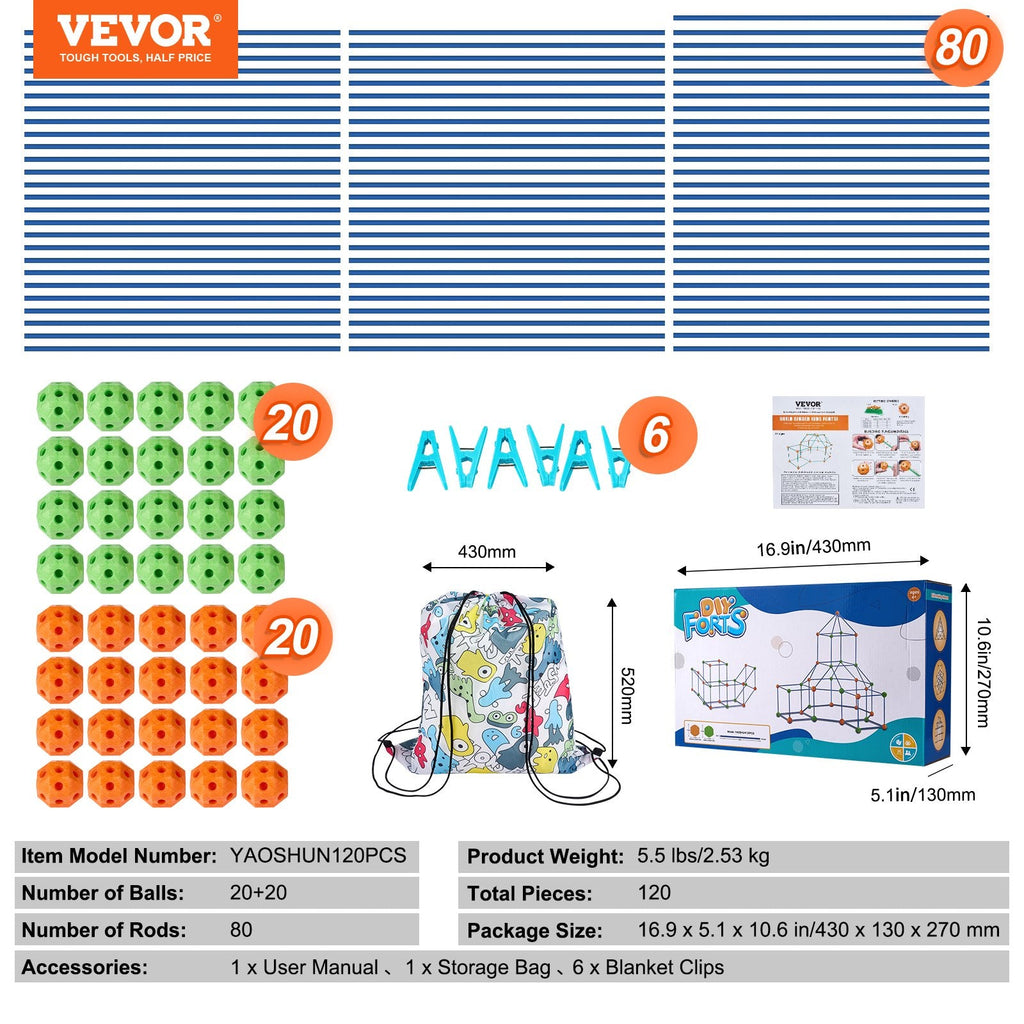 Unleash your child’s imagination with the VEVOR Tent Fort Building Kit, a 120-piece STEM construction toy designed to inspire creativity and hands-on learning. With 80 durable rods and 40 connecting balls, kids can build countless structures—from castles and tunnels to forts and playhouses. Lightweight and portable, this kit is easy to store and perfect for indoor or outdoor fun. It’s an ideal gift for birthdays, holidays, or educational playtime.