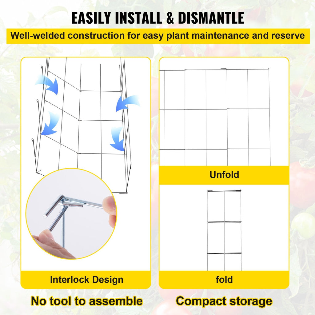 The VEVOR Tomato Cages provide sturdy and reliable support for your climbing plants, promoting healthy and vertical growth. Measuring 11.8" x 11.8" x 46.1", these square-shaped cages are made from durable silver PVC-coated steel, offering excellent resistance to rust and harsh weather conditions. Ideal for tomatoes, beans, peas, and other climbing vegetables, as well as flowers and fruits, these cages help maximize garden space and improve air circulation. This set includes 5 cages, giving you ample support for multiple plants. They are easy to assemble and disassemble, making them convenient for seasonal gardening.