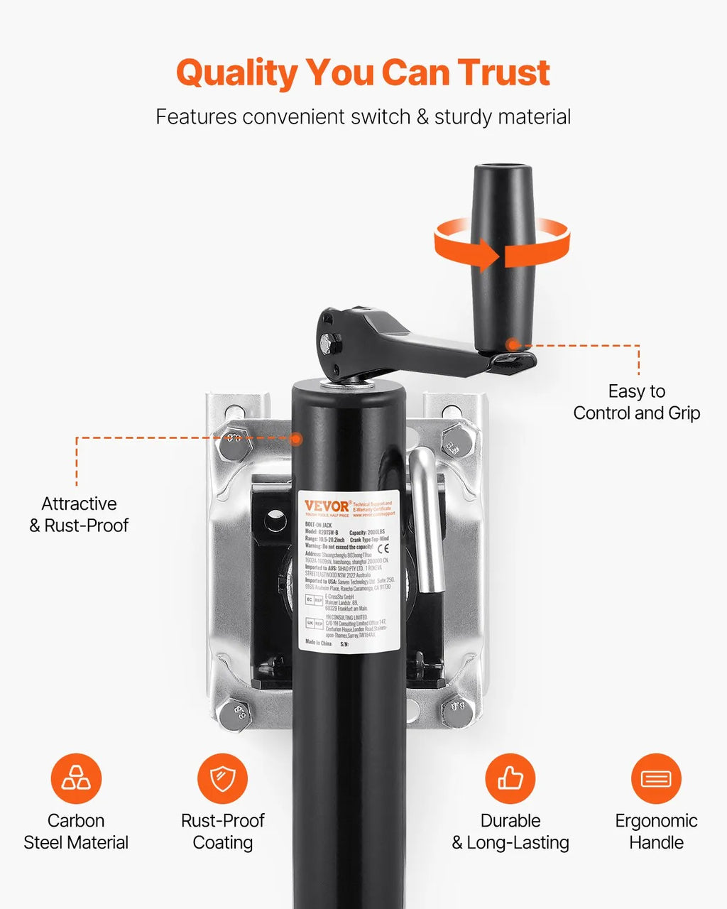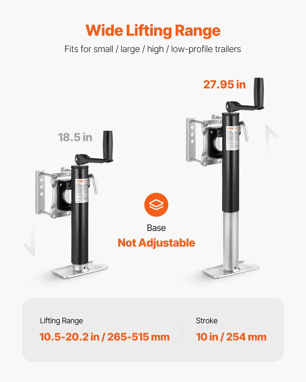 The VEVOR Bolt-On Trailer Tongue Jack is designed to provide reliable lifting support for trailers, campers, and utility vehicles. With a maximum dynamic load capacity of 2000 lbs, this heavy-duty jack ensures stable and efficient trailer positioning during hitching or maintenance. Built from durable carbon steel, it offers long-lasting strength and corrosion resistance. The jack features a 10-inch travel range and adjustable lifting height for flexible operation across different trailer types. An ergonomic handle allows smooth and effortless cranking, while the bolt-on design ensures quick installation with included accessories. Ideal for utility trailers, boat trailers, and RVs, this trailer jack delivers dependable performance for everyday towing tasks.