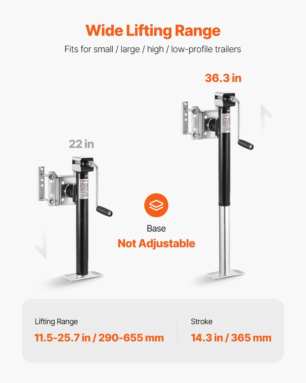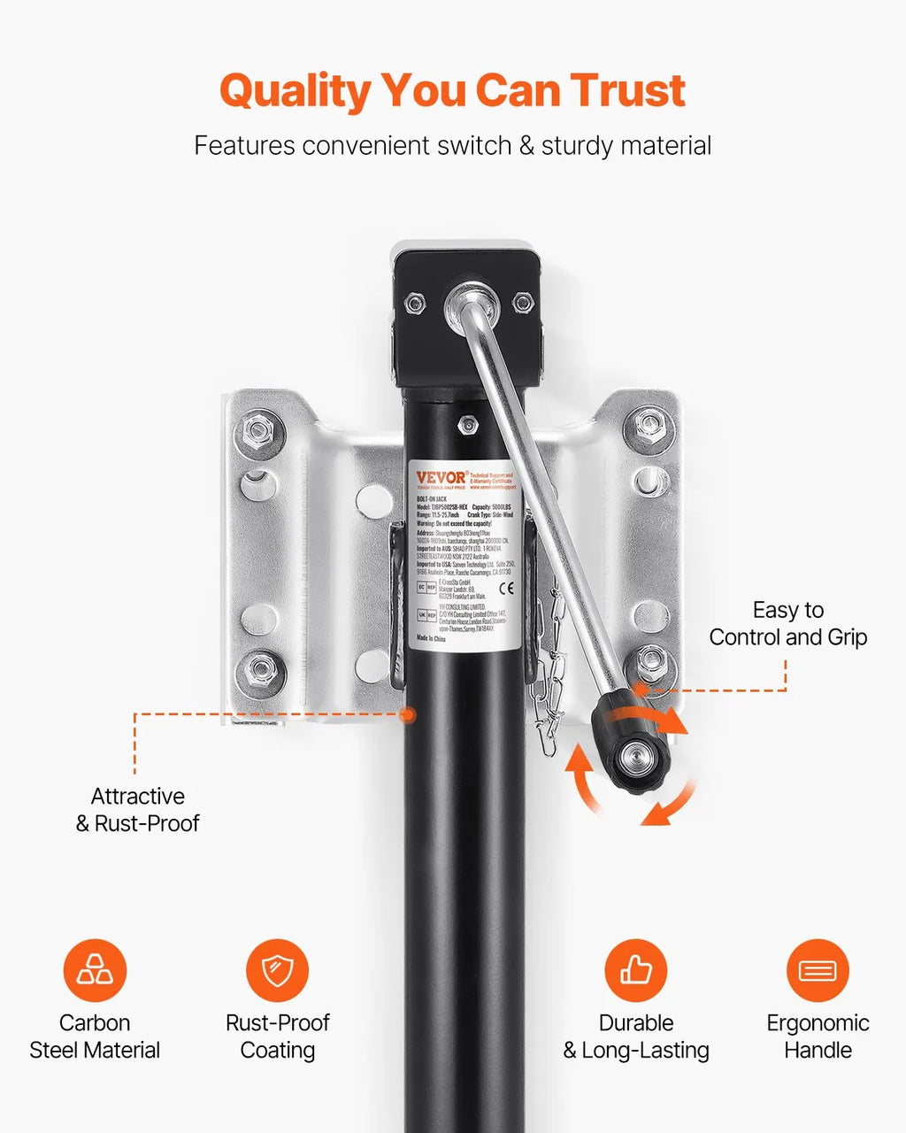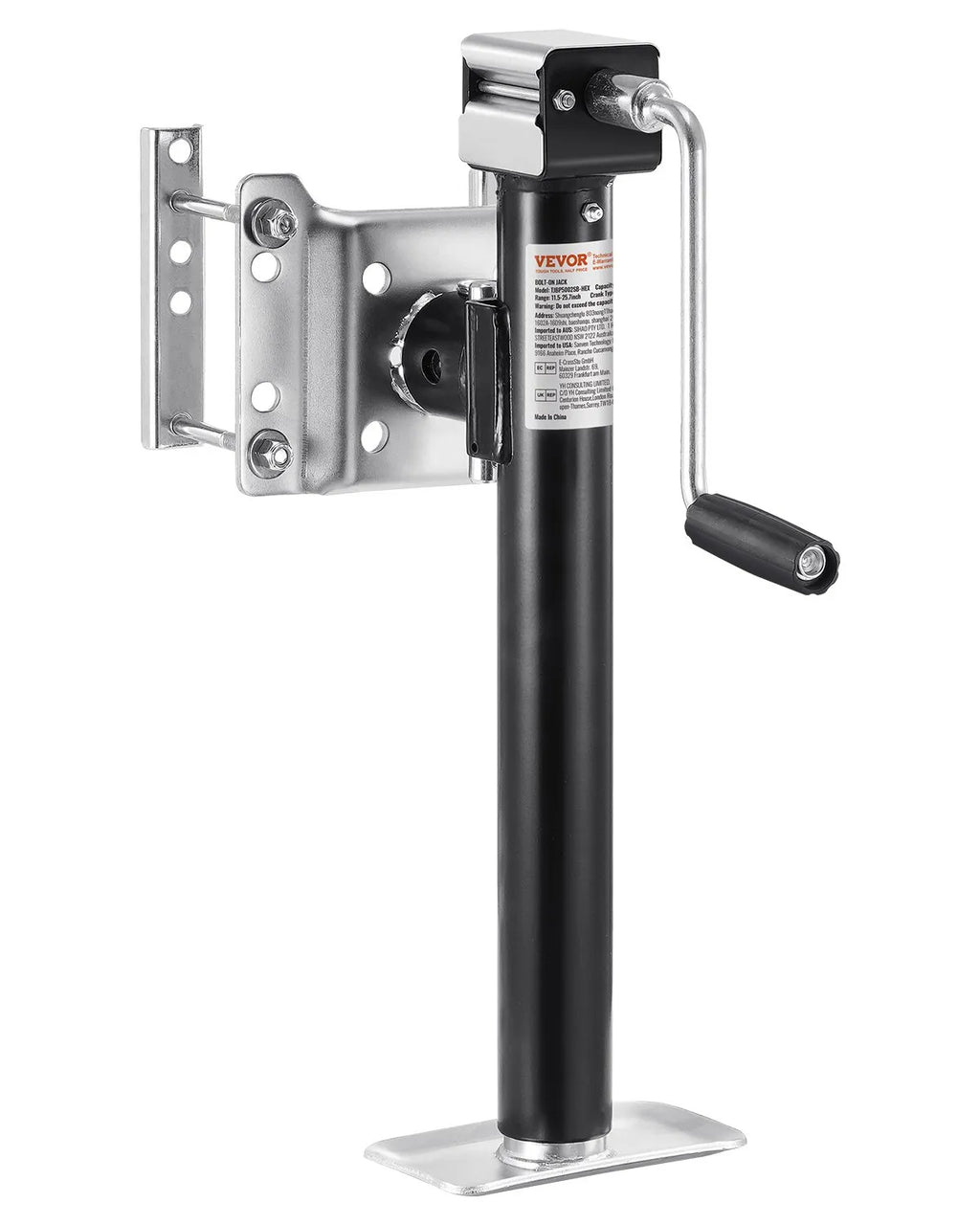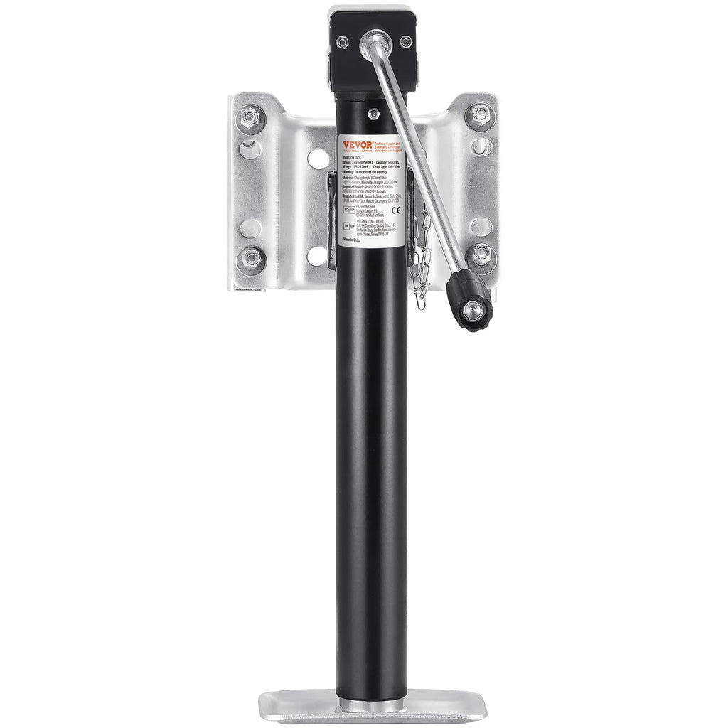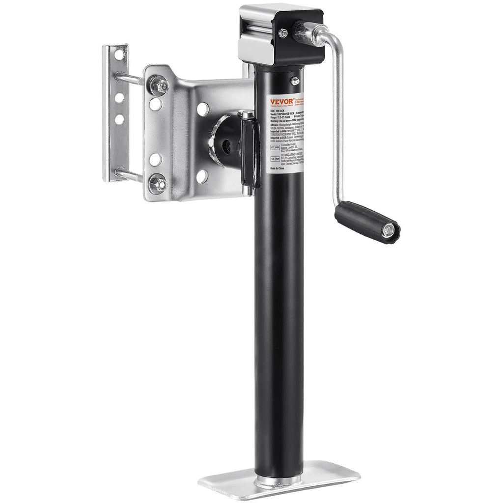 The VEVOR Bolt-On Trailer Tongue Jack is a heavy-duty lifting solution designed for trailers, RVs, and utility vehicles. With a maximum dynamic load capacity of 5000 lbs, this trailer jack delivers strong and reliable lifting support for hitching, leveling, and maintenance tasks. Constructed from durable carbon steel, it ensures long-lasting strength and resistance to wear in demanding outdoor conditions. The jack features a 14.3-inch stroke and an adjustable lifting range for flexible height positioning. An ergonomic handle provides smooth and efficient operation, while the bolt-on design allows quick installation with the included accessories. Ideal for utility trailers, boat trailers, and campers, this jack offers dependable performance for towing applications.