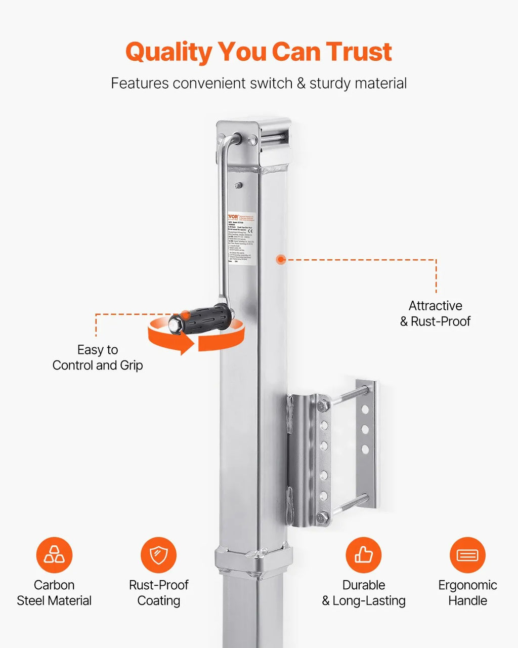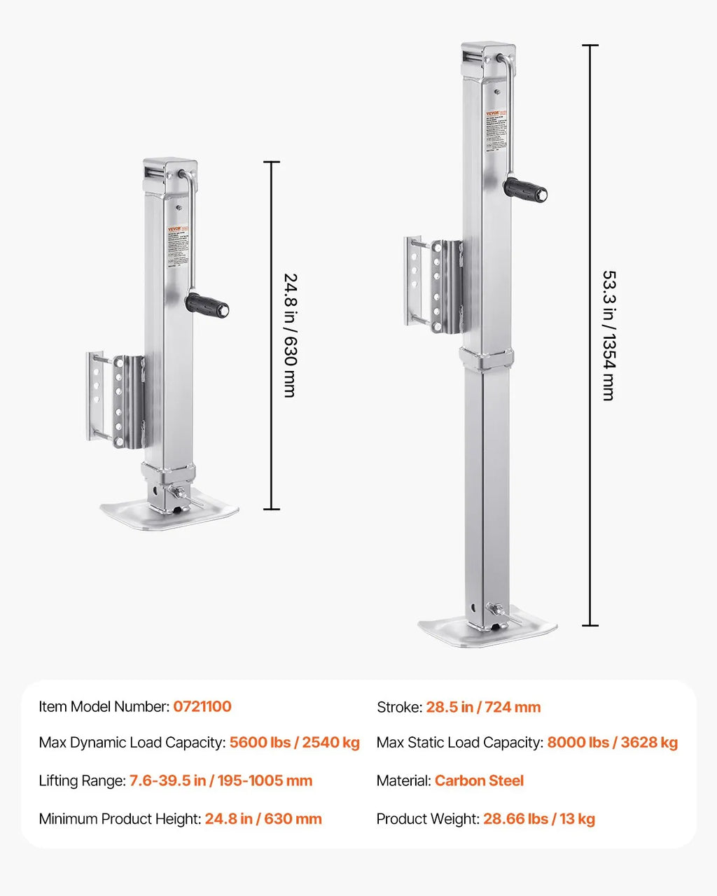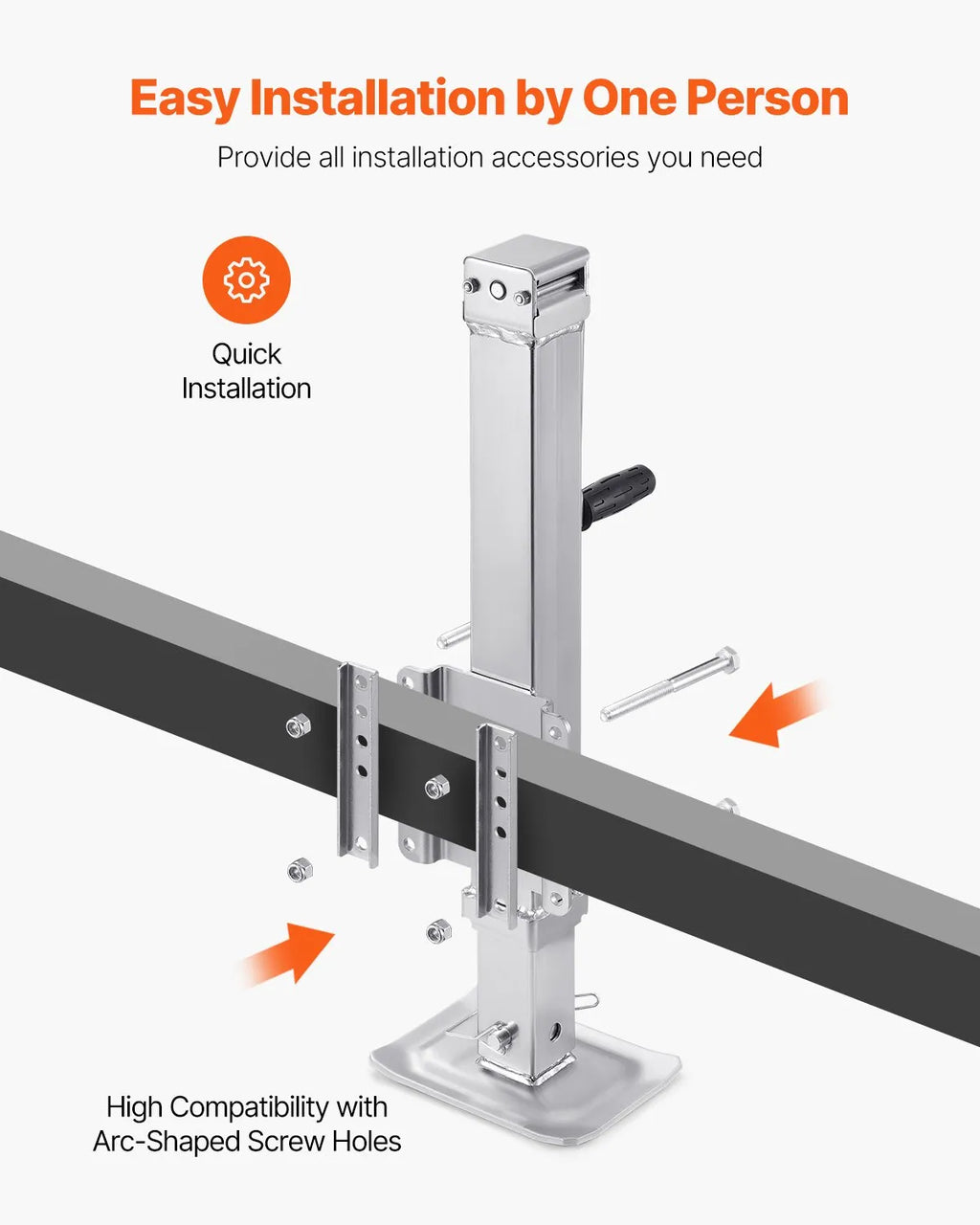 The VEVOR Bolt-On Trailer Tongue Jack is a heavy-duty lifting solution designed to provide reliable support for trailers, RVs, and utility vehicles. With an impressive static load capacity of 8000 lbs and a dynamic capacity of 5600 lbs, this jack is built to handle demanding towing and lifting tasks. Constructed from durable carbon steel, it offers excellent strength, stability, and long-term durability. The jack features an extended 28.5-inch stroke and a wide lifting range, allowing precise height adjustment for different trailer types. Its ergonomic handle ensures smooth and efficient operation, while the bolt-on design allows quick installation with included mounting accessories. Ideal for boat trailers, campers, and heavy-duty utility trailers, this jack delivers dependable performance for everyday towing needs.