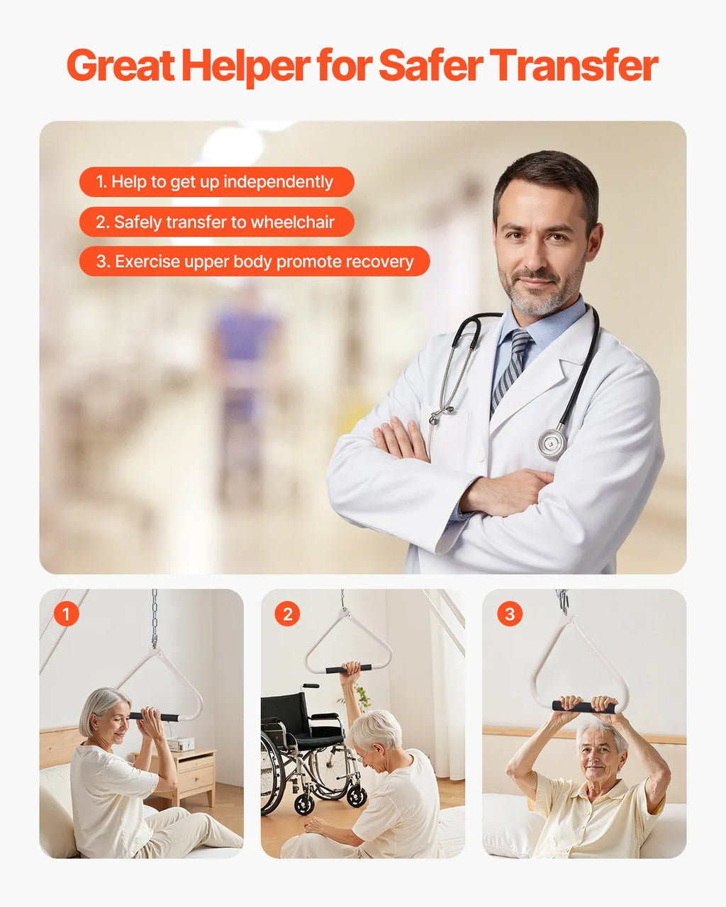 The VEVOR Bed Trapeze Bar with Clamps and Metal Chain is designed to help individuals with limited mobility reposition themselves safely and independently in bed. Made from strong Q195 steel with a durable powder-coated finish, this trapeze bar provides reliable strength and long-lasting performance. The adjustable handle height allows users to customize the support for comfortable use, while the sturdy metal chain and clamp system ensures secure attachment to various bed types. Ideal for home care, hospitals, and rehabilitation environments, this bed trapeze bar improves mobility and makes daily movement easier for both users and caregivers.