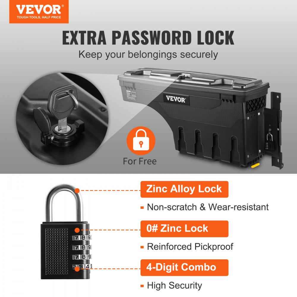 Maximize your truck bed utility with the VEVOR Lockable Swing Storage Box—custom-designed for Ford F-150 models from 2015 to 2021 (passenger side). This 6.6-gallon swing case offers secure, waterproof, and easily accessible storage that mounts directly over the wheel well without sacrificing bed space. Built from heavy-duty ABS and carbon steel, it swings out for convenience and includes a password padlock for added security.