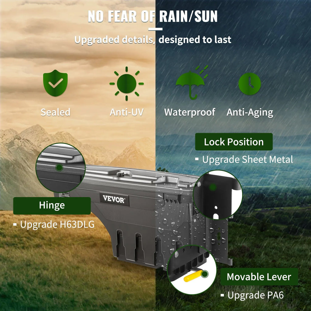 The VEVOR Truck Bed Storage Tool Box is a secure and durable solution for organizing tools and gear in Chevrolet Silverado 1500 and GMC Sierra 1500 trucks (2019–2020, left and right sides). Made from ABS and carbon steel, this toolbox provides a hermetically sealed, waterproof barrier to protect contents from water, dust, and debris. Easy to install with included brackets and hinge pins, it ensures a perfect fit and reliable storage for all your essential items.