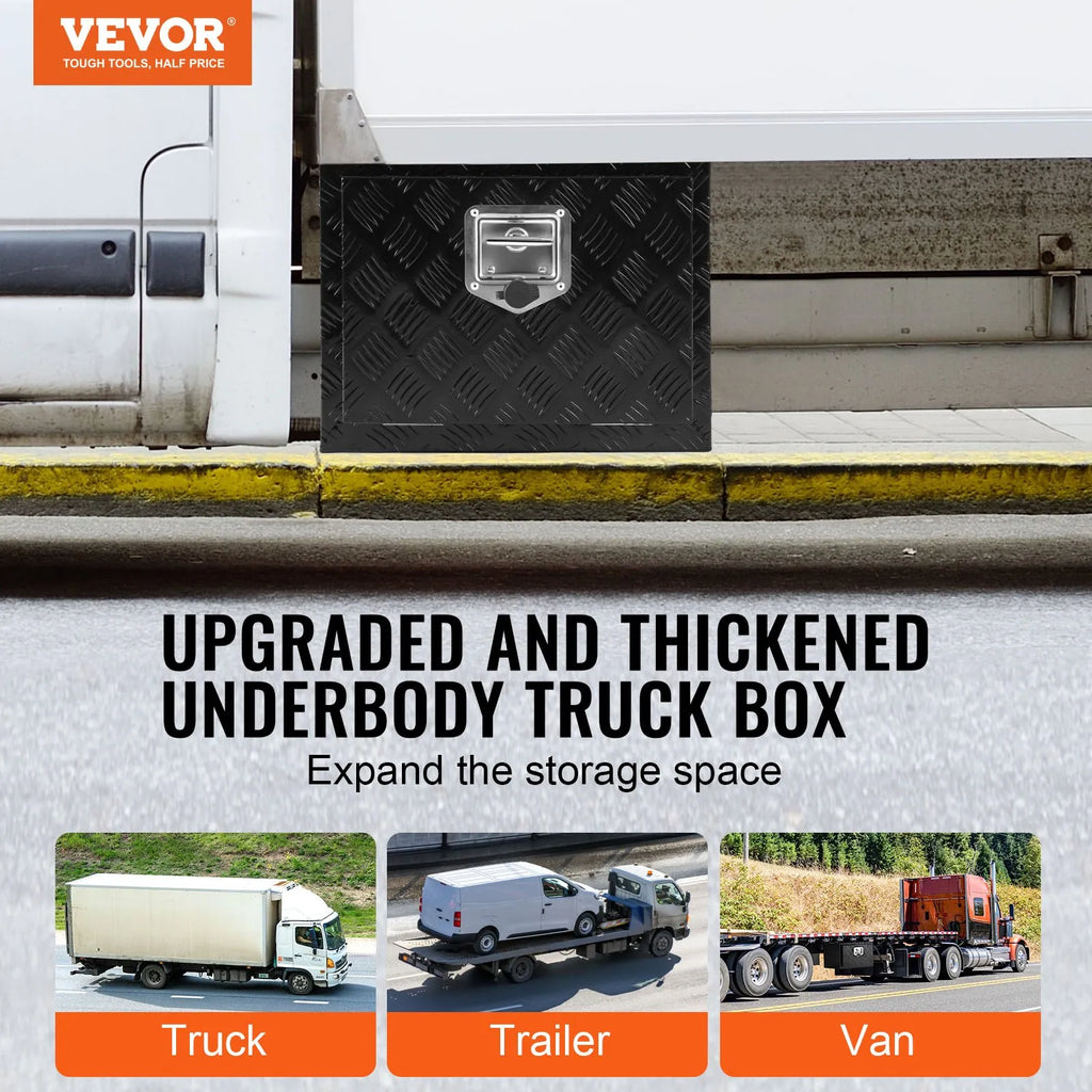 The VEVOR Underbody Aluminum Truck Tool Box is a durable and secure storage solution designed for trailers, RVs, and large vehicles. Constructed from rust-resistant aluminum, it offers excellent waterproof protection and theft-proof performance. With hidden hinges and a T-shaped handle, this tool box ensures both security and convenience, making it an essential accessory for organized vehicle storage.