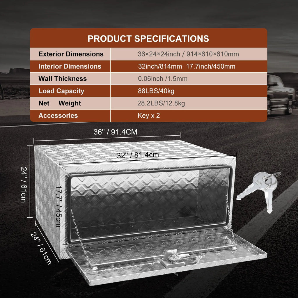The VEVOR Underbody Truck Box is a heavy-duty storage solution for trucks, vans, and trailers. Made from aluminum diamond plate, this waterproof tool box safeguards your tools and equipment from weather and theft. It features a T-handle latch, hidden hinge, and lock with keys for secure and convenient access. With a spacious interior and strong construction, it is ideal for organizing and protecting all your essential gear.