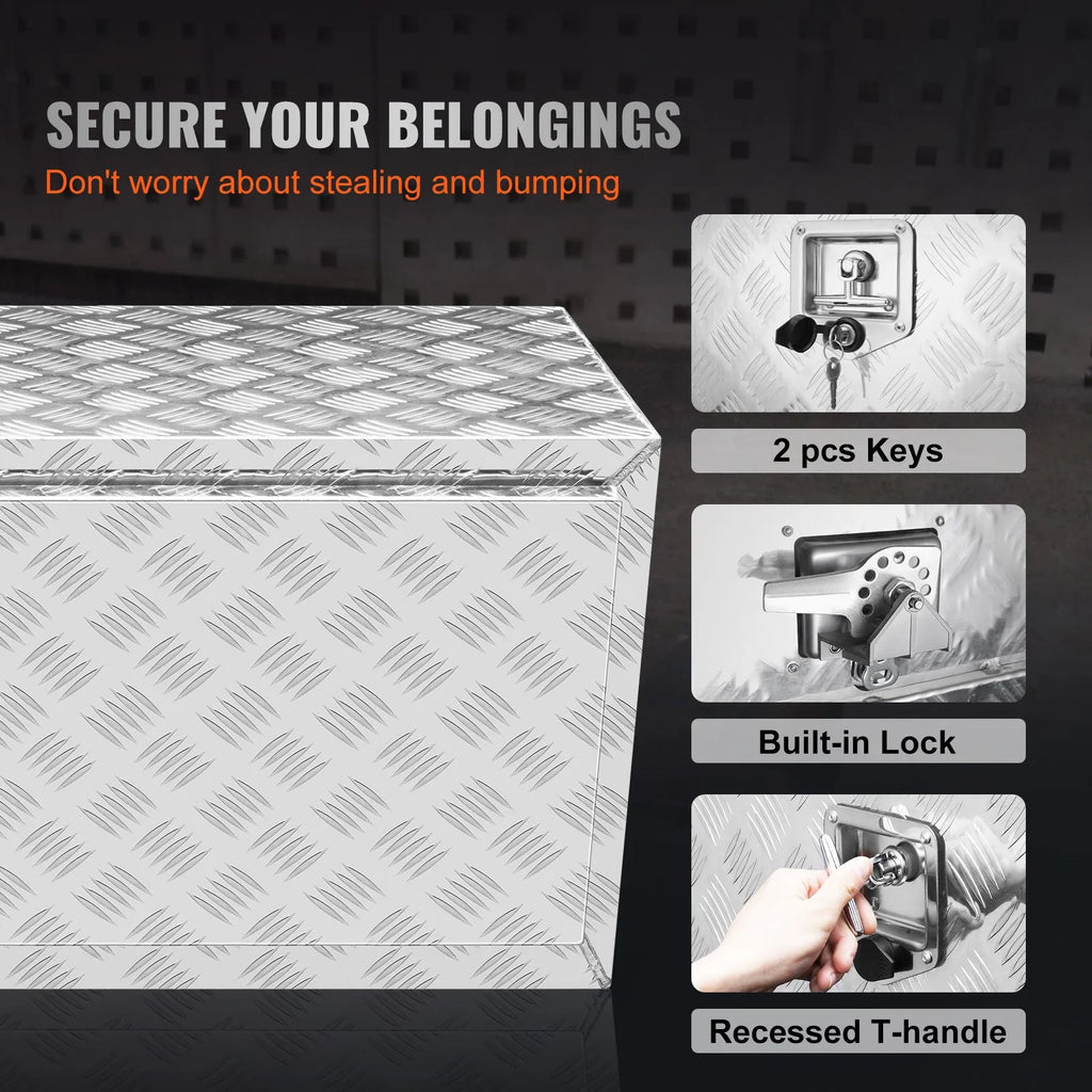 The VEVOR Underbody Truck Box is a heavy-duty storage solution designed for trucks, vans, and trailers. Made from aluminum diamond plate, this waterproof tool box protects your tools and equipment from weather and theft. Featuring a T-handle latch, hidden hinge, and lock with keys, it provides secure and convenient access. Its large interior and robust construction make it perfect for organizing and safeguarding all your essential gear.