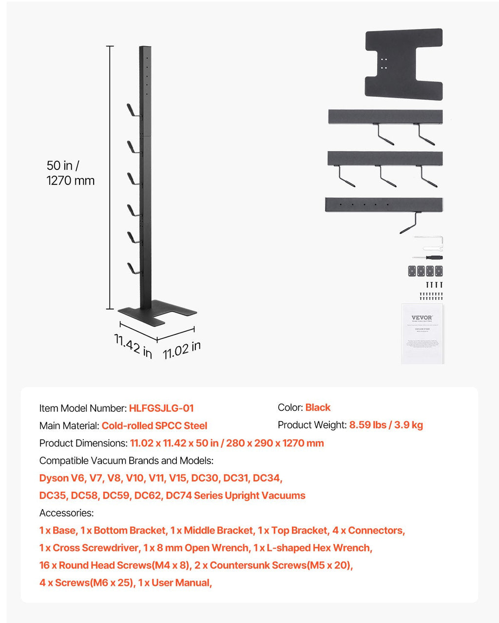 The VEVOR Vacuum Stand is a sleek and sturdy storage solution designed to fit most Dyson vacuum models. Constructed from cold-rolled SPCC steel, this durable bracket holder keeps your vacuum and accessories organized in one compact, upright space. With six integrated hooks and a stable base, you can store tools neatly without drilling holes or damaging your walls. Ideal for apartments, homes, and offices, it helps declutter your space while ensuring your vacuum is always within reach.