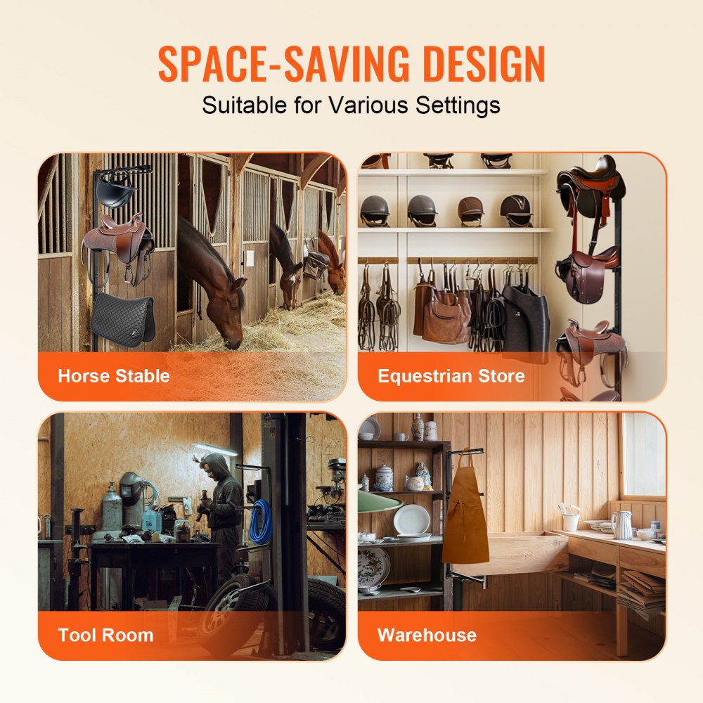 The VEVOR Wall Mount Saddle Rack is designed to provide smart storage solutions for both Western and English saddles. With four spacious tiers, this rack helps you organize and protect your saddles efficiently, whether you're a professional rider or an enthusiast. The durable, rust-resistant construction ensures long-lasting performance, making it a great addition to any stable or barn.