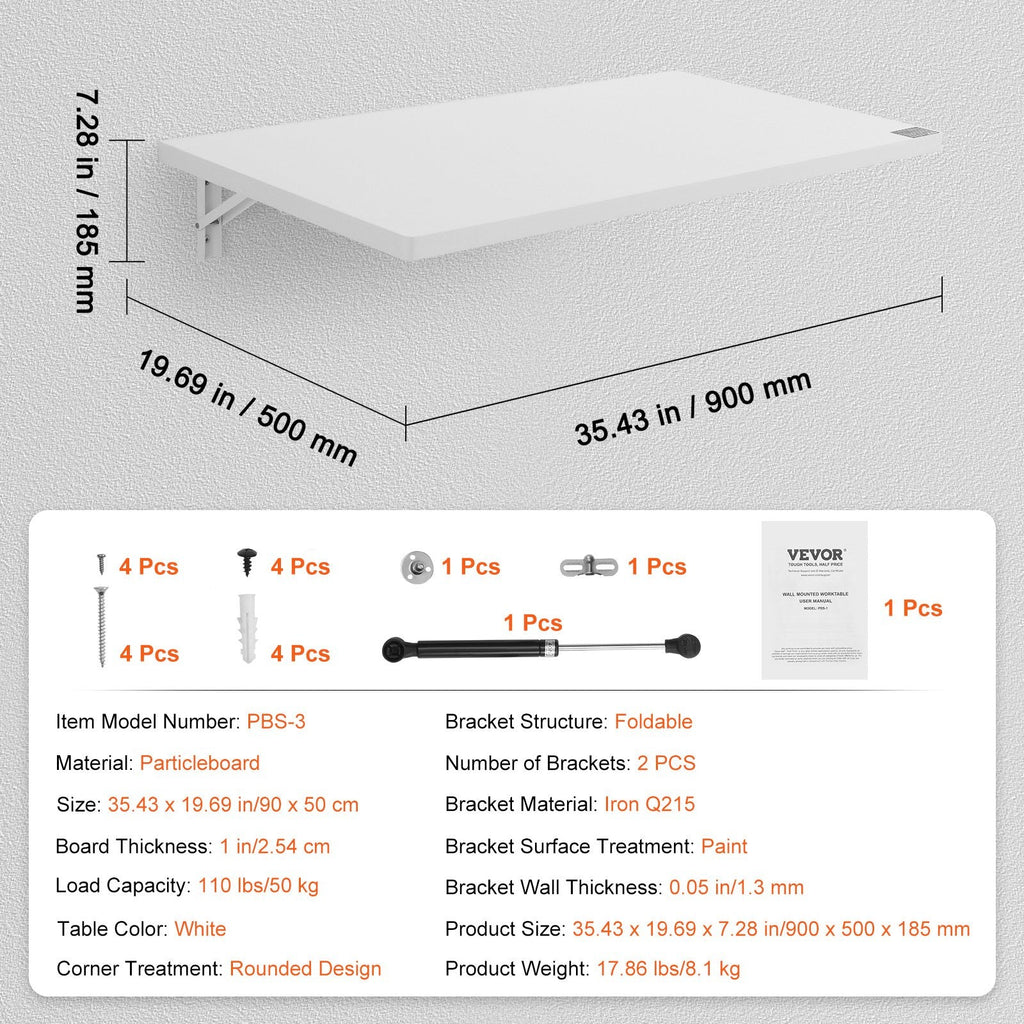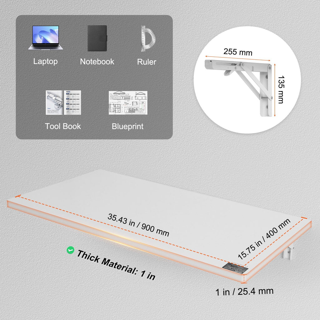 The VEVOR Wall Mounted Folding Table is a stylish and practical solution for small spaces. This space-saving floating desk features a drop-leaf design and is perfect for use in home offices, kitchens, dining areas, laundry rooms, or even bars. The high-quality iron bracket and premium particleboard ensure durability, while the fold-down design allows for easy storage when not in use. The table can support up to 110 lbs, making it ideal for various tasks, from writing to dining. Its safe rounded corners add an extra layer of safety, especially in homes with children.