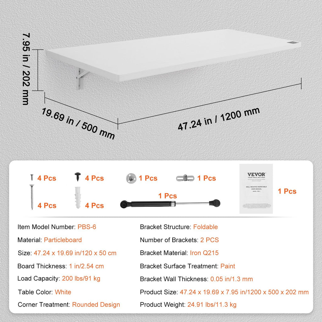 Maximize your space without sacrificing style or functionality with the VEVOR Wall Mounted Folding Table. Featuring a spacious 47.24" x 19.69" surface and robust iron brackets, this floating desk is perfect for compact areas such as home offices, kitchens, laundry rooms, or small apartments. Built with sturdy particleboard and a sleek white finish, this fold-down table provides reliable support up to 200 lbs and folds away neatly when not in use. With safe rounded corners and easy wall installation, it's a smart solution for any modern space.