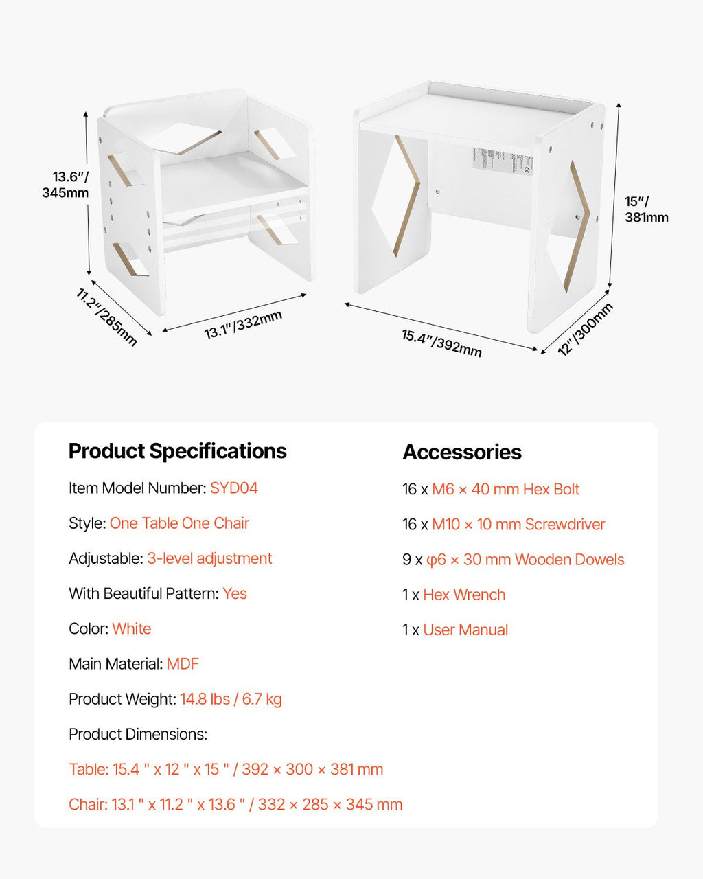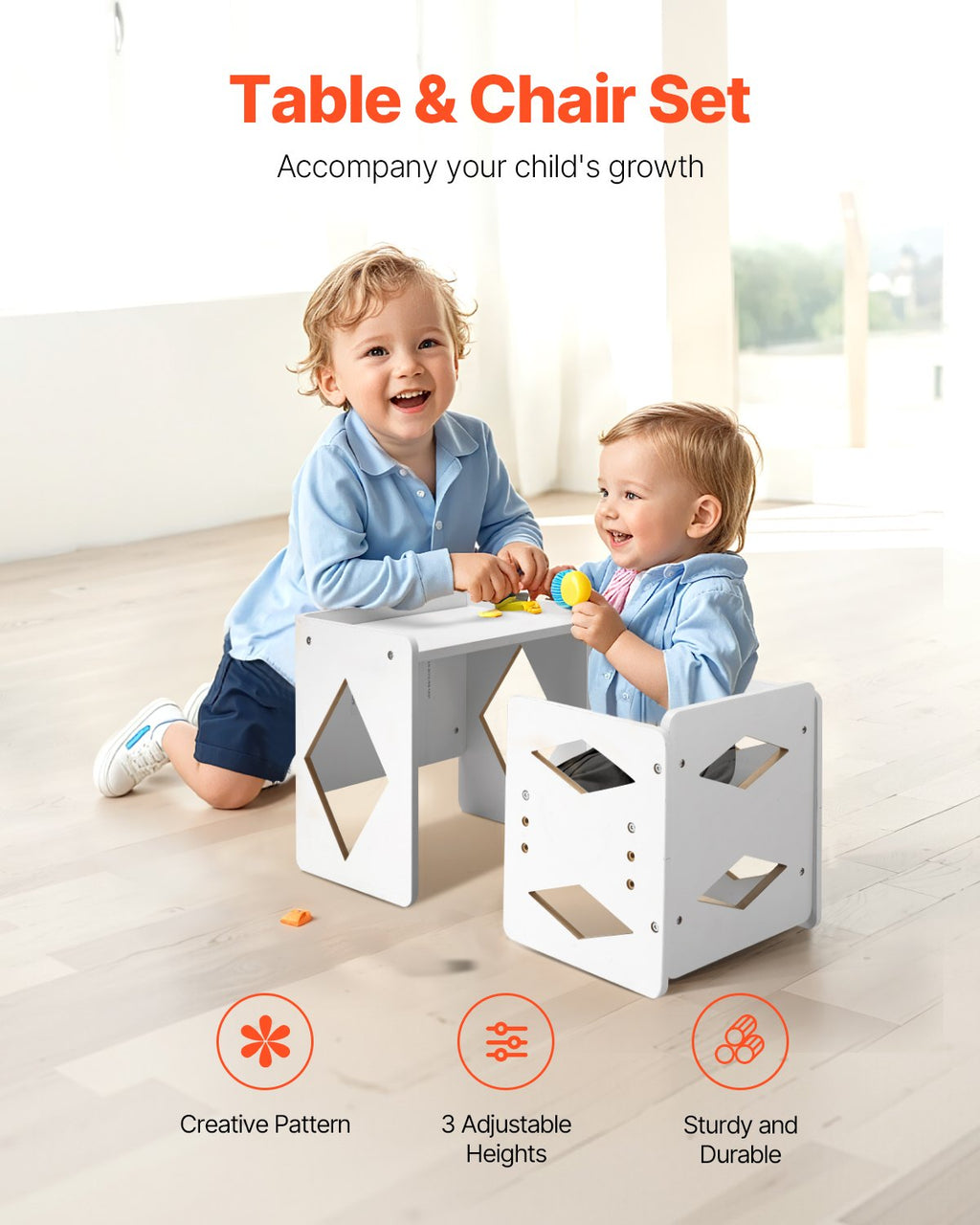 Encourage independence and creativity in young learners with the VEVOR Montessori Weaning Table and Chair Set. Designed with toddlers in mind, this multifunctional table and chair duo provides the perfect environment for eating, playing, reading, and learning. The beautiful white finish and charming patterns add a touch of elegance, while its adjustable design and durable MDF construction ensure it grows with your child. Easy to assemble and made with safety in mind, it's a must-have for Montessori-inspired spaces.