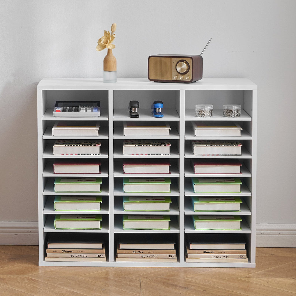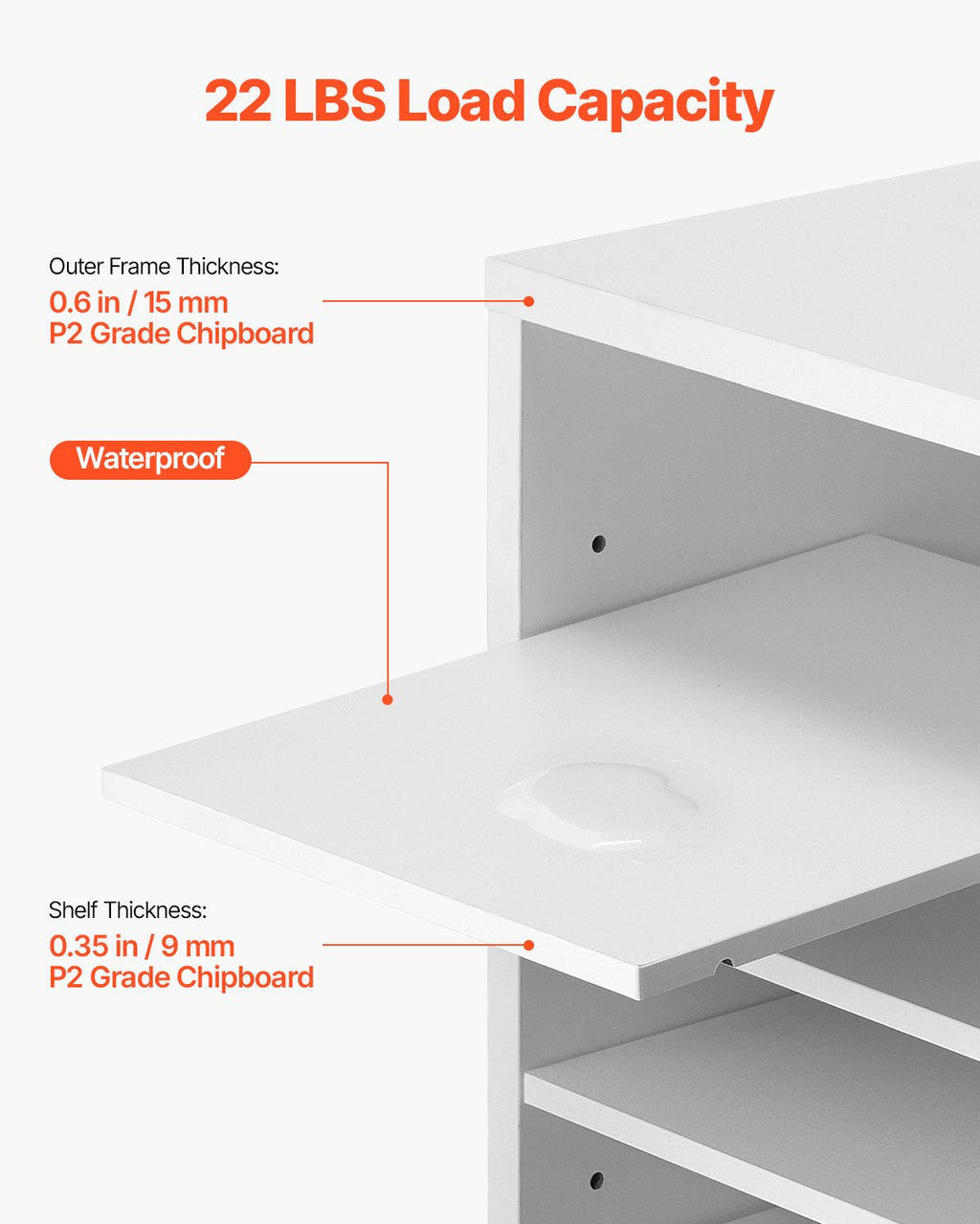 Stay organized with the VEVOR 24-Compartment Wooden Literature Organizer, a perfect solution for sorting documents, mail, and office supplies. With adjustable shelf spacing and a large capacity, this durable white organizer is designed for flexibility and functionality in any workspace. Constructed from high-quality veneered chipboard and MDF, it supports up to 22 lbs per shelf and features protective baffles to keep contents secure. Whether used in classrooms, offices, or home study areas, this file sorter is your go-to for efficient organization.