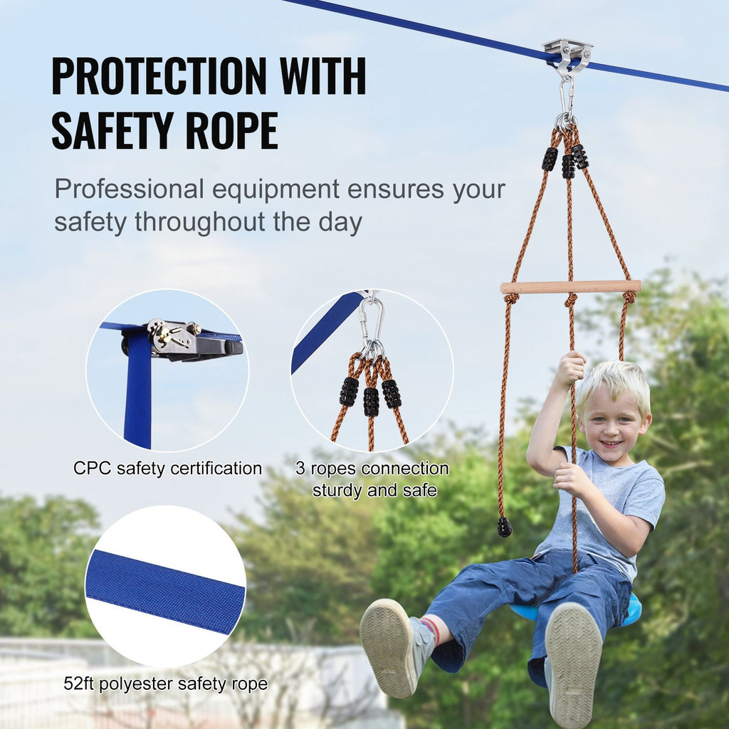 The VEVOR Zipline Kit for Kids and Adults is a thrilling outdoor adventure set designed for backyard fun and physical activity. With a 52 ft zip line that can support up to 500 lbs, this kit offers a high-quality, safe, and easy way to enjoy a zipline experience right in your own yard. The kit includes a nylon safety harness, seat, handlebar, and a smooth ball bearing design for a fast and secure ride. Perfect for kids and adults alike, it’s a fantastic way to get active while enjoying the great outdoors.