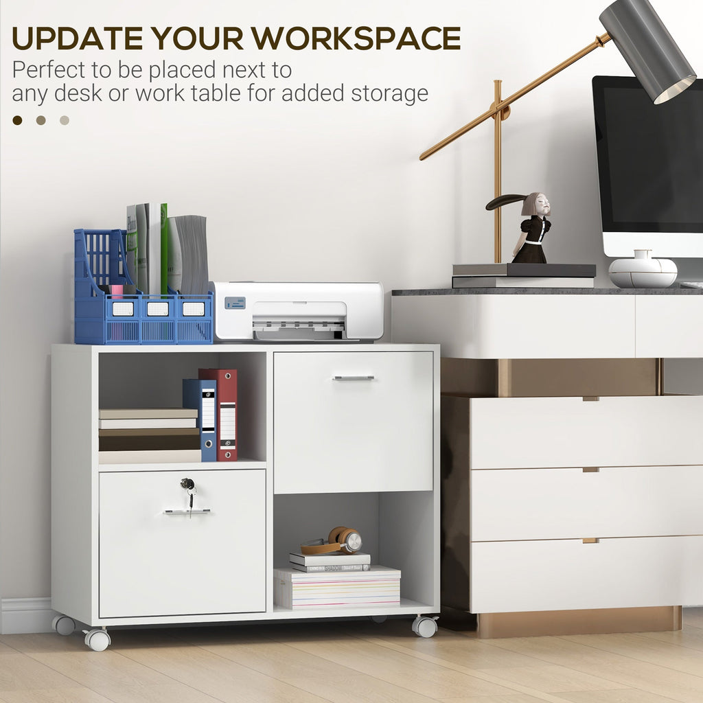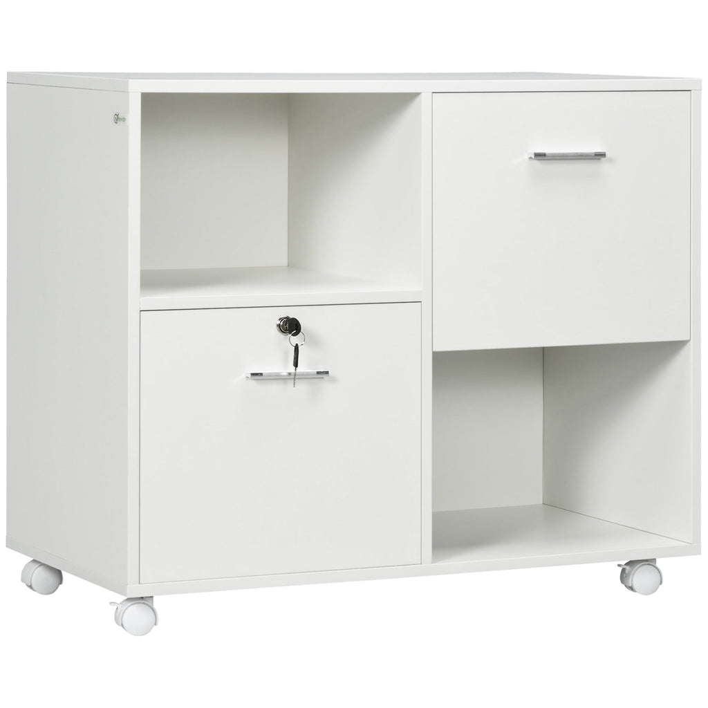 Keep your workspace tidy and efficient with this multifunctional filing cabinet, designed for small offices and home workspaces. With two spacious open shelves and two drawers with built-in hanging bars, it offers the perfect solution for storing everything from important paperwork and folders to office essentials like printer paper and stationery. The bottom drawer includes a secure lock with two keys, so your confidential documents stay protected. The sturdy tabletop is ideal for printers, scanners, or décor, and smooth-rolling wheels make it easy to reposition the unit wherever you need it. Two locking casters ensure the cabinet stays put once in place. Whether you’re organizing your daily workflow or simply freeing up desk space, this compact file cabinet offers everything in its place—neat, accessible, and secure.