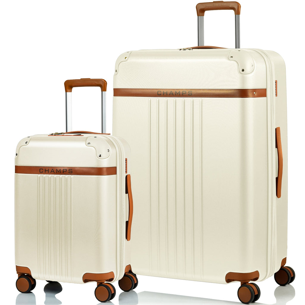 The Vintage Collection by Champs is a 2-piece luggage set designed for modern travelers seeking style, convenience, and versatility. The set includes a Carry-on and a Large check-in bag, both crafted from premium lightweight polycarbonate for durability and a sleek aesthetic. Smooth spinner wheels ensure effortless mobility, while recessed TSA-approved locks provide enhanced security. The Carry-on features built-in USB-A and USB-C ports for on-the-go device charging, and the Large check-in bag offers ample space for extended trips. With expandable compartments, this collection adapts to your packing needs, making it ideal for individuals and couples alike.