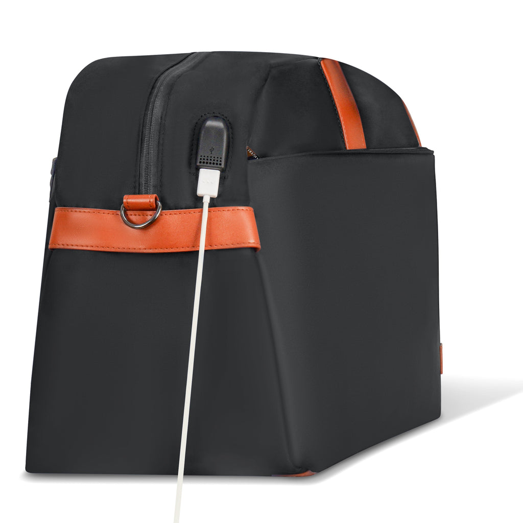 Travel in style with the Vintage Collection Duffle Bag, combining classic elegance with modern functionality. Designed for effortless mobility, the trolley strap allows you to attach it easily to your luggage. Stay connected with a built-in USB port, while dedicated laptop and tablet sleeves protect your tech on the go. The specialized shoe pocket keeps footwear separate, maintaining cleanliness for your clothes. Crafted from water-resistant material with a waterproof zipper, this duffle bag safeguards your belongings in all weather. An integrated key clip ensures quick access to essentials, making it the ideal companion for organized and stylish travel.