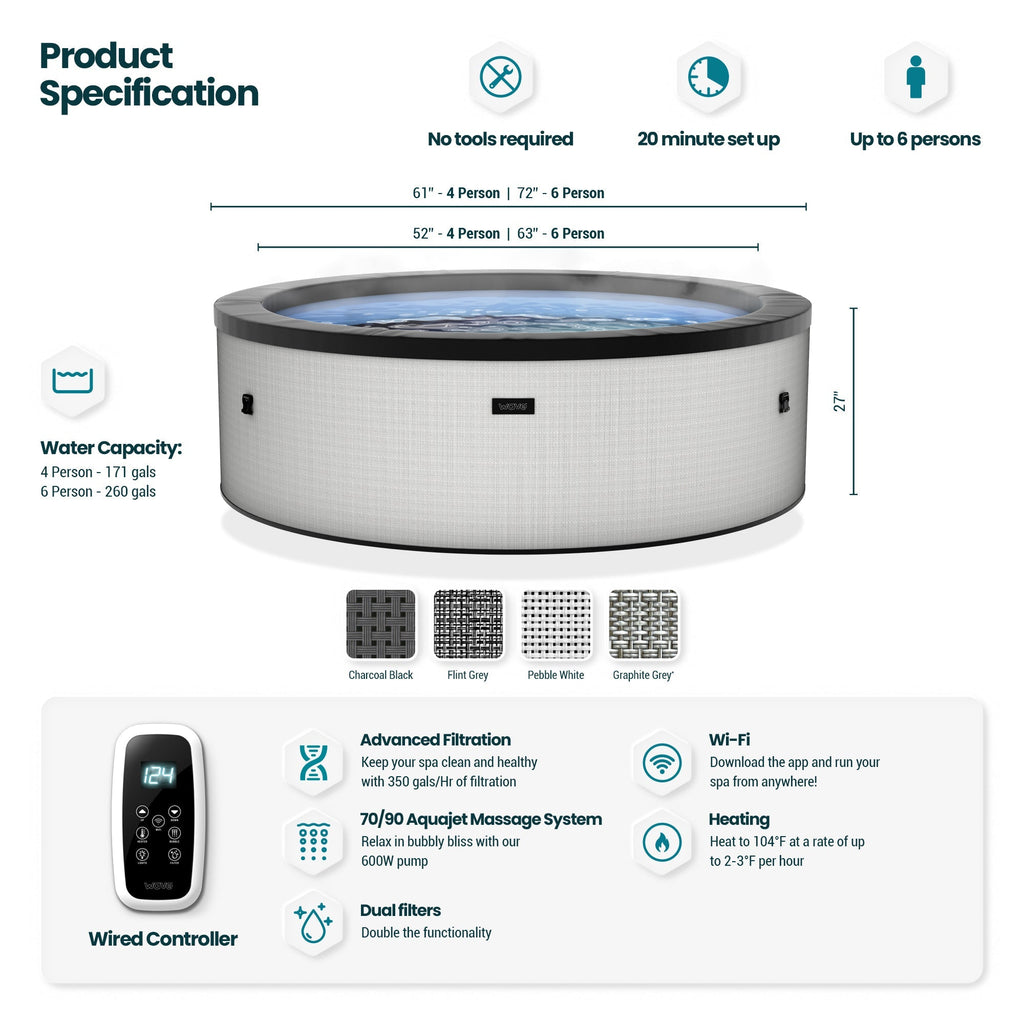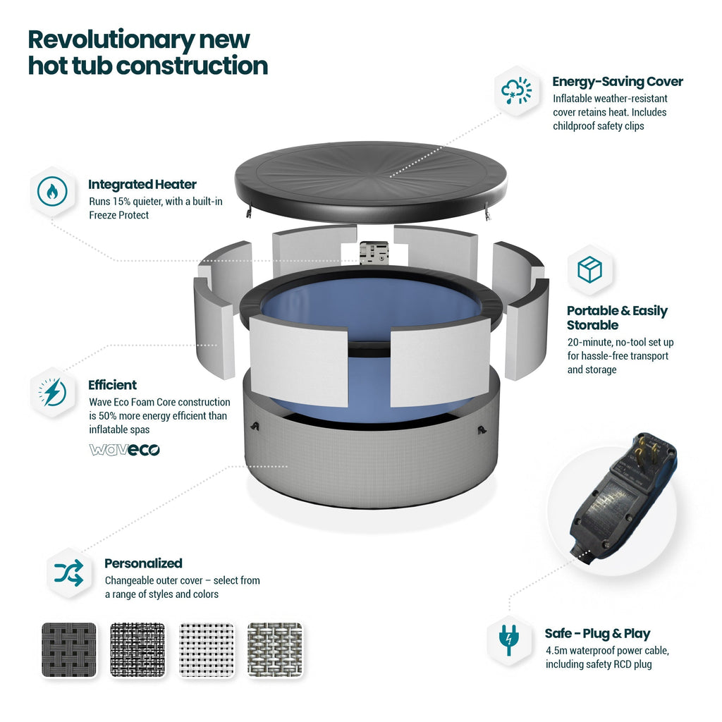 Introducing the Wave Tahoe, a sophisticated round eco foam hot tub designed for ultimate relaxation. Available in 4- or 6-person sizes, this Charcoal Black spa features an integrated 1800W eco heater, providing 50% higher thermal efficiency than traditional hot tubs for lower energy costs. Its sleek, quiet design and rounded silhouette offer a modern, elegant addition to any home, patio, or garden.