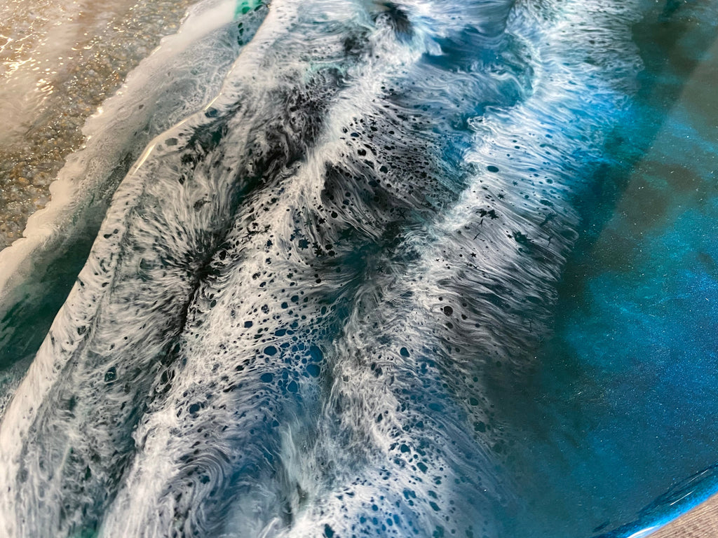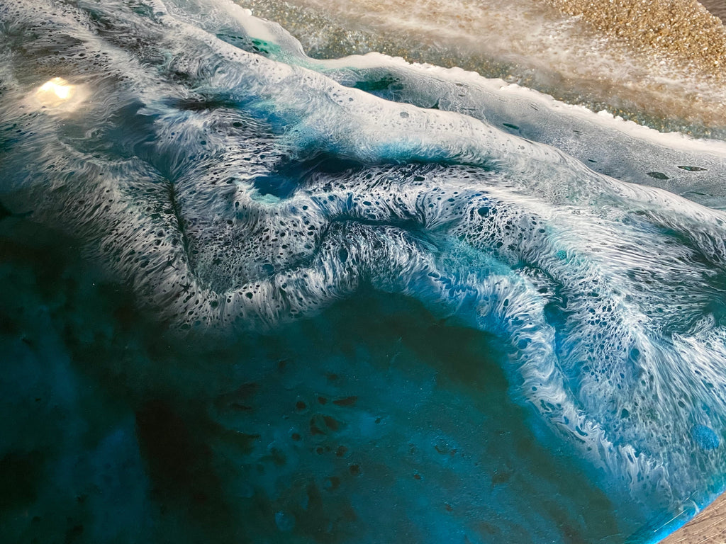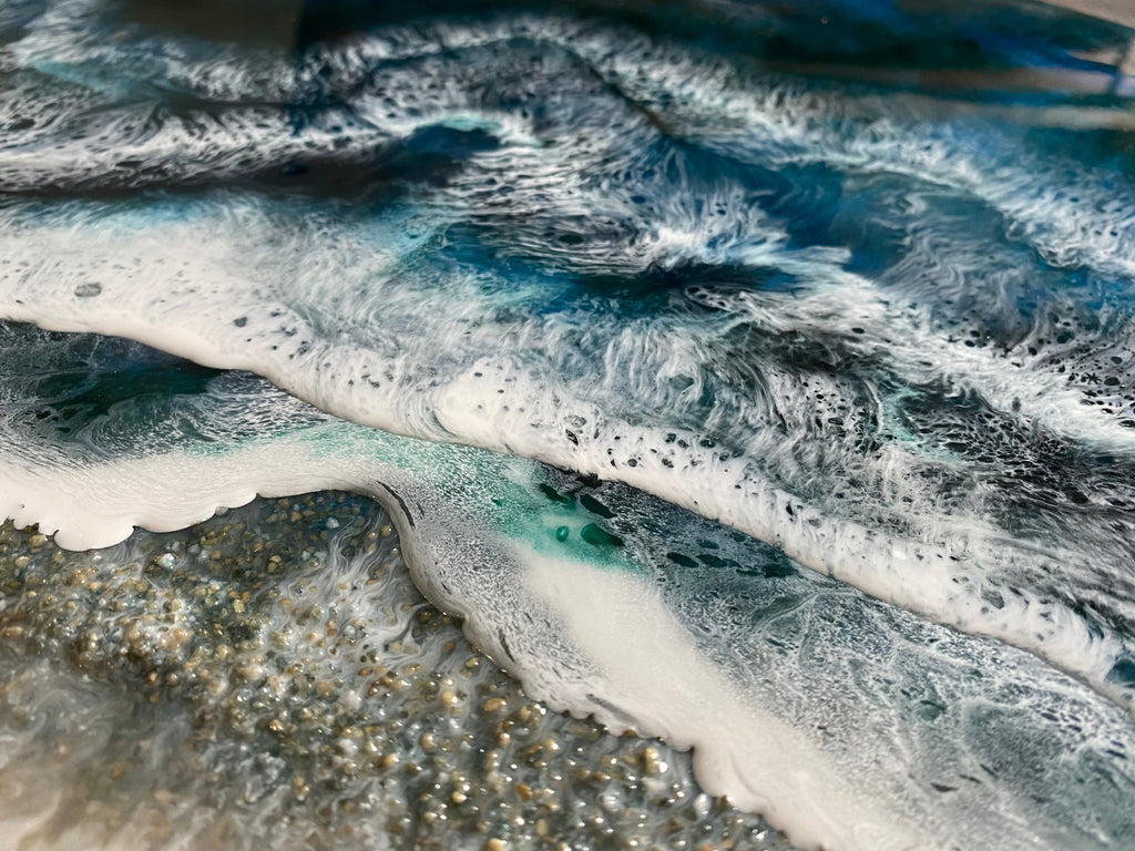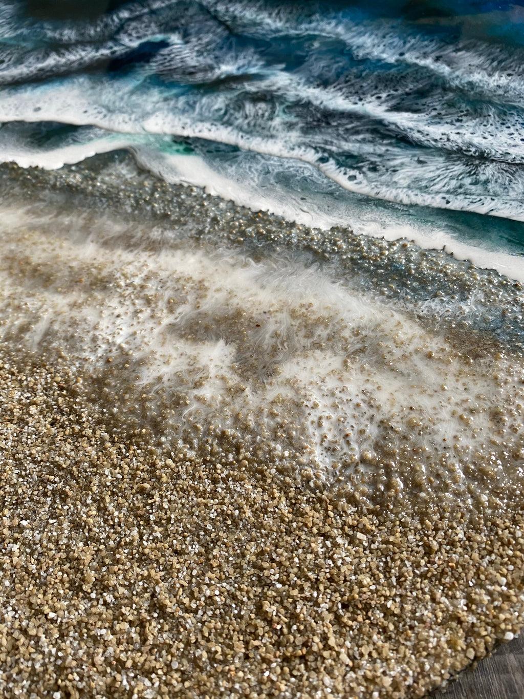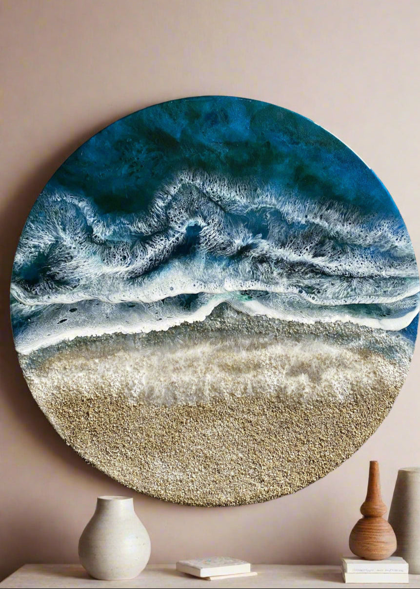 West Coast Winter is a bold round ocean-inspired artwork featuring deep dark waves flowing over a richly textured sandy beach. Set on solid wood, this striking piece captures the raw beauty of the coast and delivers strong visual impact, making it a powerful statement artwork for modern and coastal interiors.