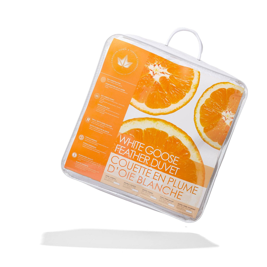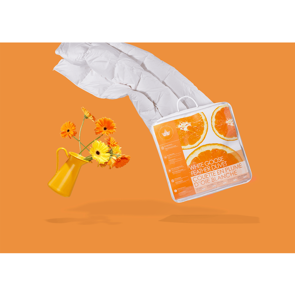 Sleep in comfort with this luxurious white goose feather duvet. The crisp 233 thread count cotton shell keeps the feather fill breathable, while the generously filled interior provides excellent loft and warmth. Designed with box construction to prevent shifting and corner loops to secure duvet covers. All Season Weight ideal for room temperatures of 16–18°C. Hypoallergenic and OEKO-TEX® certified for safety and quality. Imported.