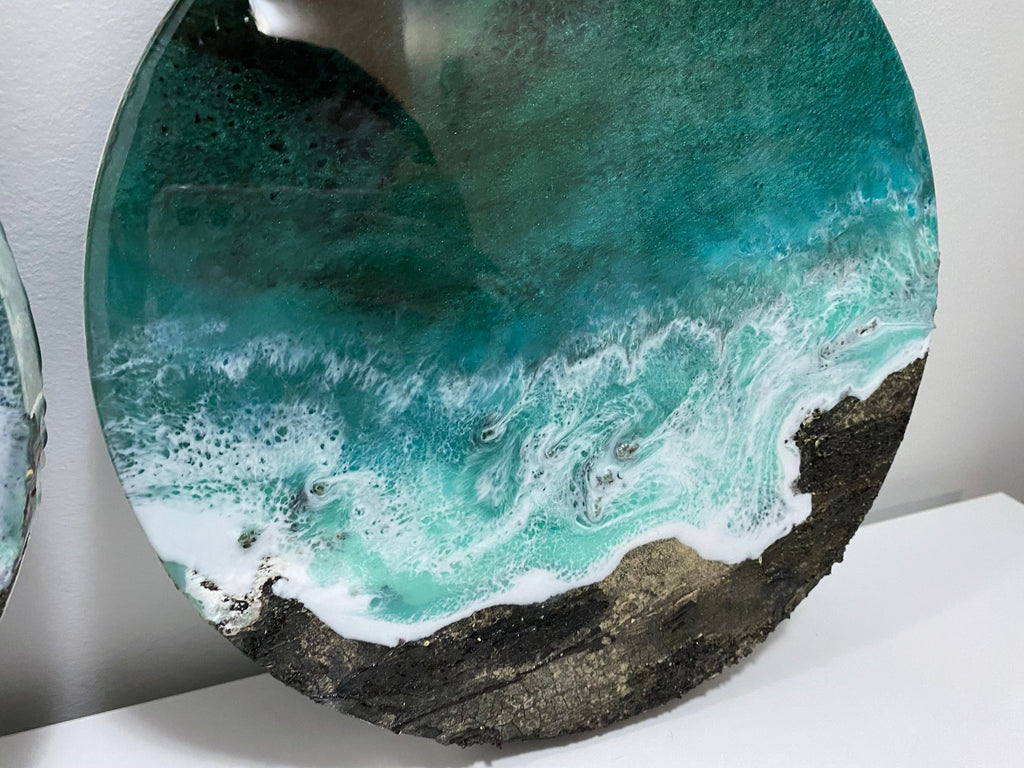 Wickaninnish Beach Set is a beautiful collection of original coastal artworks presented as 10 inch round paintings on cradled birch panels. Each piece is sealed under archival grade resin, enhancing depth, clarity, and longevity while capturing the serene movement and natural beauty of the shoreline.