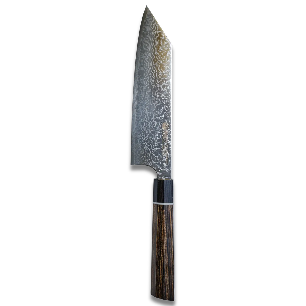 Unlock culinary excellence with the Seki Kanetsugu Kiritsuke Gyuto 210mm, a handcrafted masterpiece designed for chefs and culinary enthusiasts alike. Featuring San Mai construction with a double-edged 50/50 grind, the R2/SG2 core steel undergoes precise heat treatment to reach 62-63 HRC, delivering exceptional edge retention and sharpness. Its elegant Damascus finish combines beauty with functionality, while the ergonomic Shichikaku (Heptagon) pakkawood handle ensures perfect balance, control, and comfort. Ideal for slicing, dicing, and chopping with professional precision.